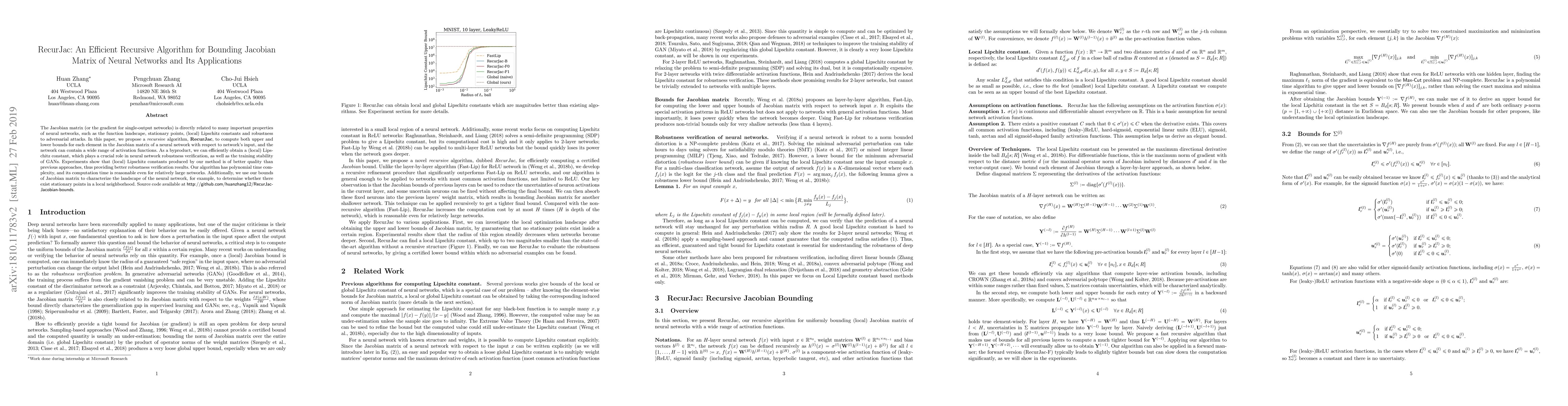This paper introduces RecurJac, a recursive algorithm for efficiently computing upper and lower bounds of the Jacobian matrix in neural networks, facilitating better robustness verification and training stability. The method provides high-quality (local) Lipschitz constants and characterizes neural network landscapes, with polynomial time complexity suitable for large networks.