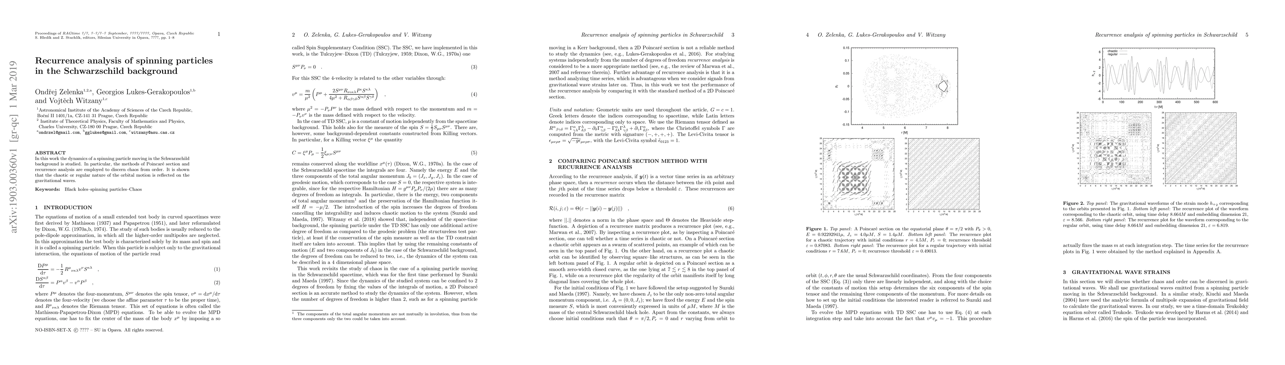 In this work the dynamics of a spinning particle moving in the Schwarzschild background is studied. In particular, the methods of Poincar\'{e} section and recurrence analysis are employed to discern chaos from order. It is shown that the chaotic or regular nature of the orbital motion is reflected on the gravitational waves.