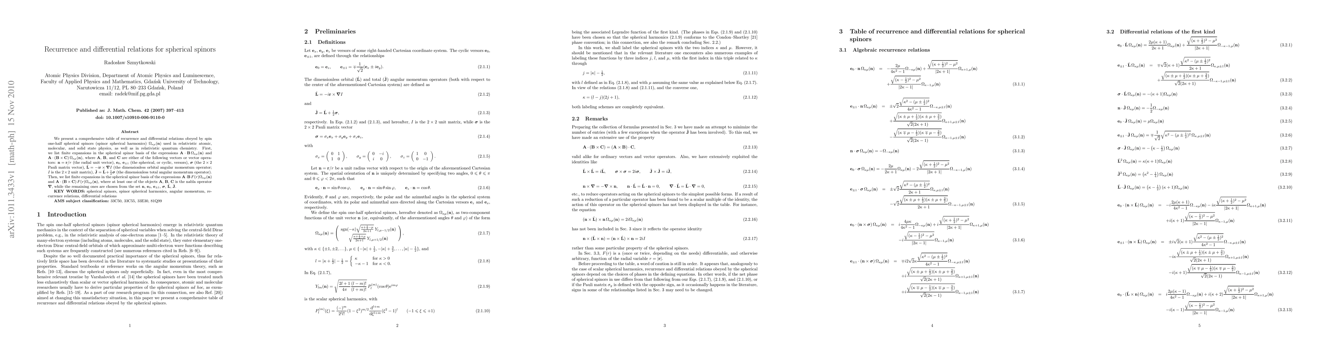 We present a comprehensive table of recurrence and differential relations obeyed by spin one-half spherical spinors (spinor spherical harmonics) $\Omega_{\kappa\mu}(\mathbf{n})$ used in relativistic atomic, molecular, and solid state physics, as well as in relativistic quantum chemistry. First, we list finite expansions in the spherical spinor basis of the expressions $\mathbf{A}\cdot\mathbf{B}\,\Omega_{\kappa\mu}(\mathbf{n})$ and {$\mathbf{A}\cdot(\mathbf{B}\times\mathbf{C})\, \Omega_{\kappa\mu}(\mathbf{n})$}, where $\mathbf{A}$, $\mathbf{B}$, and $\mathbf{C}$ are either of the following vectors or vector operators: $\mathbf{n}=\mathbf{r}/r$ (the radial unit vector), $\mathbf{e}_{0}$, $\mathbf{e}_{\pm1}$ (the spherical, or cyclic, versors), $\boldsymbol{\sigma}$ (the $2\times2$ Pauli matrix vector), $\hat{\mathbf{L}}=-i\mathbf{r}\times\boldsymbol{\nabla}I$ (the dimensionless orbital angular momentum operator; $I$ is the $2\times2$ unit matrix), $\hat{\mathbf{J}}=\hat{\mathbf{L}}+1/2\boldsymbol{\sigma}$ (the dimensionless total angular momentum operator). Then, we list finite expansions in the spherical spinor basis of the expressions $\mathbf{A}\cdot\mathbf{B}\,F(r)\Omega_{\kappa\mu}(\mathbf{n})$ and $\mathbf{A}\cdot(\mathbf{B}\times\mathbf{C})\, F(r)\Omega_{\kappa\mu}(\mathbf{n})$, where at least one of the objects $\mathbf{A}$, $\mathbf{B}$, $\mathbf{C}$ is the nabla operator $\boldsymbol{\nabla}$, while the remaining ones are chosen from the set $\mathbf{n}$, $\mathbf{e}_{0}$, $\mathbf{e}_{\pm1}$, $\boldsymbol{\sigma}$, $\hat{\mathbf{L}}$, $\hat{\mathbf{J}}$.