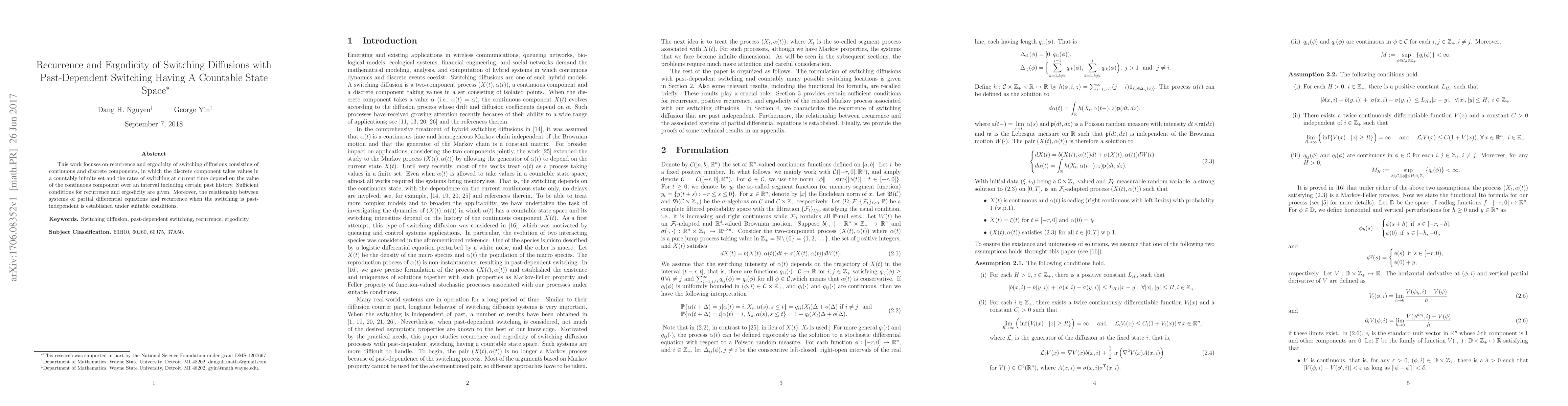 This paper investigates recurrence and ergodicity in switching diffusions with discrete components that depend on past history. It provides sufficient conditions for these properties and establishes a connection between such systems and partial differential equations when switching is past-independent.