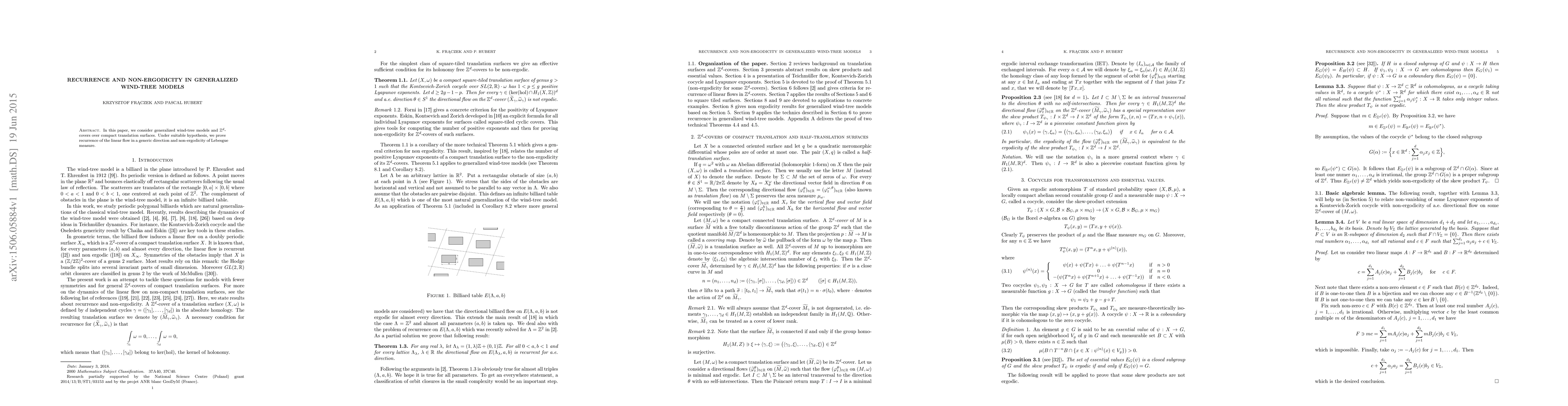 In this paper, we consider generalized wind-tree models and $\Z^d$-covers over compact translation surfaces. Under suitable hypothesis, we prove recurrence of the linear flow in a generic direction and non-ergodicity of Lebesgue measure.