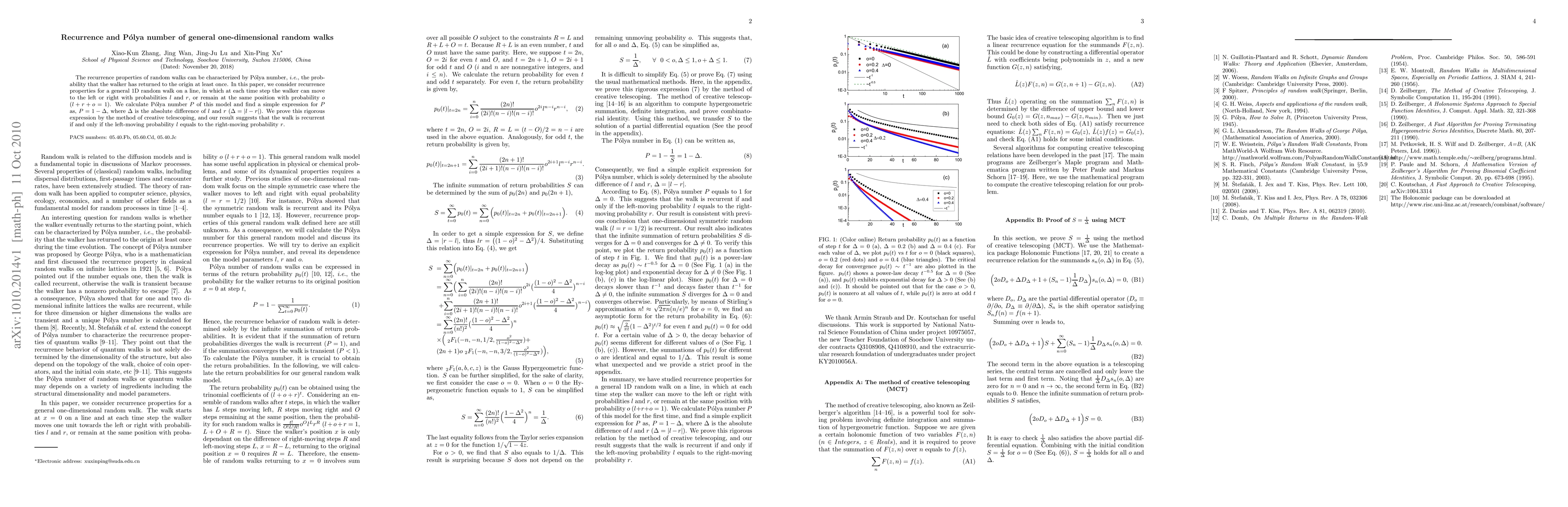The recurrence properties of random walks can be characterized by P\'{o}lya number, i.e., the probability that the walker has returned to the origin at least once. In this paper, we consider recurrence properties for a general 1D random walk on a line, in which at each time step the walker can move to the left or right with probabilities $l$ and $r$, or remain at the same position with probability $o$ ($l+r+o=1$). We calculate P\'{o}lya number $P$ of this model and find a simple expression for $P$ as, $P=1-\Delta$, where $\Delta$ is the absolute difference of $l$ and $r$ ($\Delta=|l-r|$). We prove this rigorous expression by the method of creative telescoping, and our result suggests that the walk is recurrent if and only if the left-moving probability $l$ equals to the right-moving probability $r$.