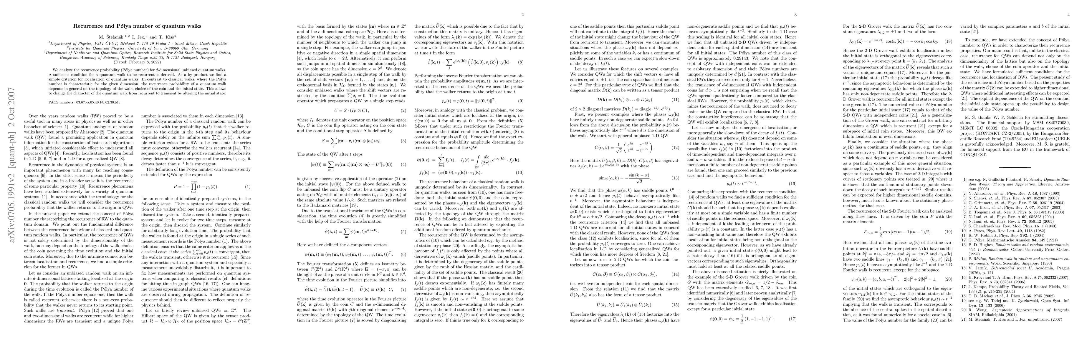 This paper derives a sufficient condition for recurrence in d-dimensional unbiased quantum walks, showing that their recurrence probability depends on the topology, coin choice, and initial state, unlike classical walks. It also provides a criterion for localizing quantum walks, demonstrating how the initial state can transform a quantum walk from recurrent to transient.