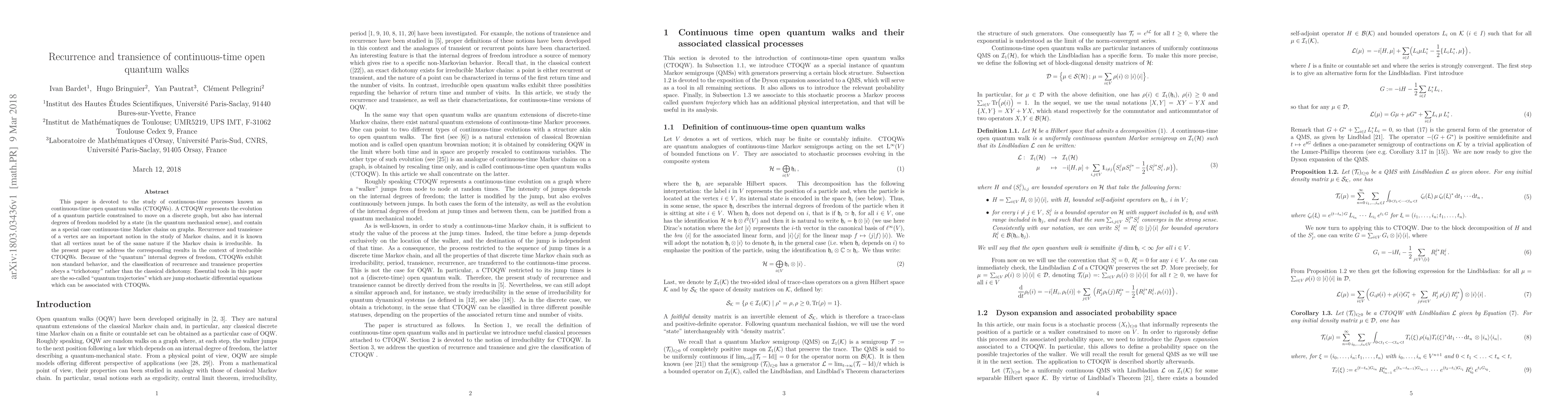 This paper investigates the recurrence and transience of continuous-time open quantum walks (CTOQWs) on discrete graphs, revealing that irreducible CTOQWs follow a "trichotomy" classification due to quantum internal degrees of freedom, unlike the classical dichotomy of Markov chains. Quantum trajectories, modeled by jump stochastic differential equations, are essential tools in this analysis.