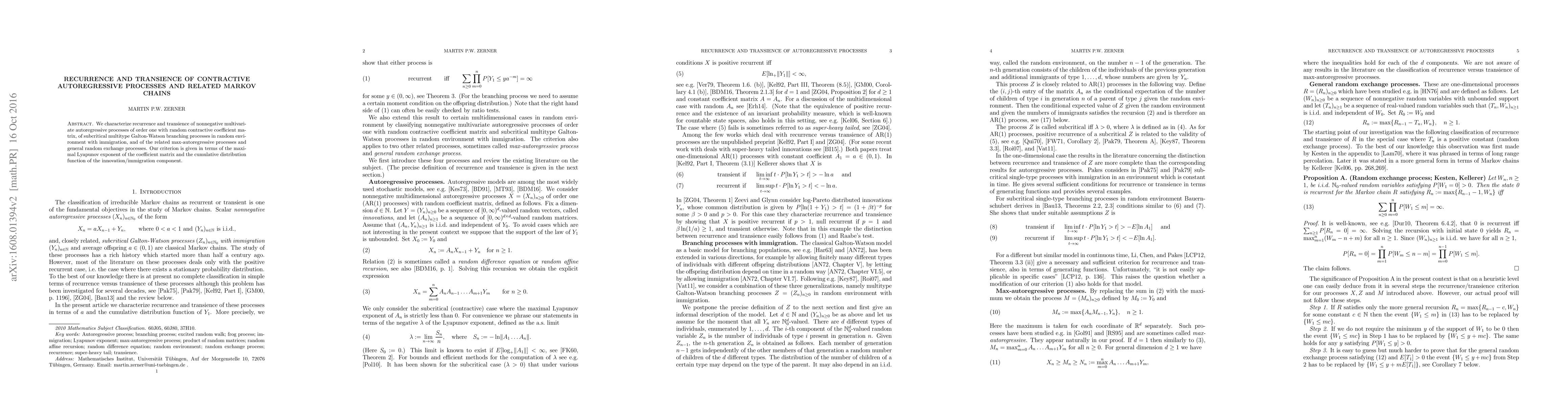 This paper investigates the recurrence and transience properties of various stochastic processes, including autoregressive processes, branching processes, and related Markov chains, using the maximal Lyapunov exponent and the distribution of innovation/immigration components as key criteria.