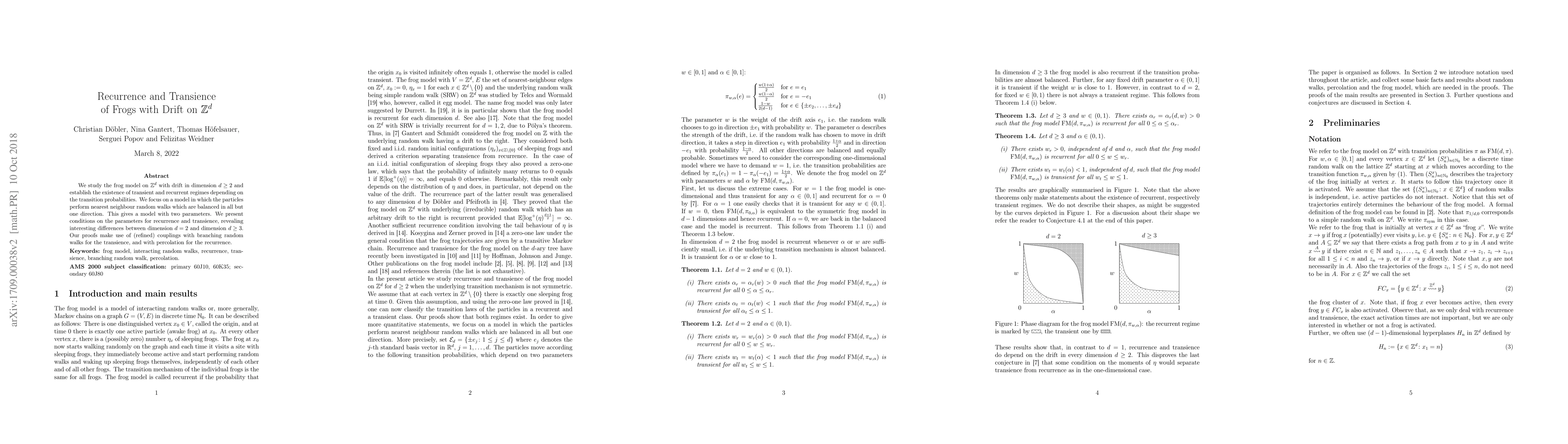 The paper investigates the frog model on $\mathbb{Z}^d$ with drift, identifying recurrence and transience regimes based on transition probabilities. It finds significant differences in behavior between dimensions $d=2$ and $d \geq 3$, using refined couplings and percolation techniques for analysis.