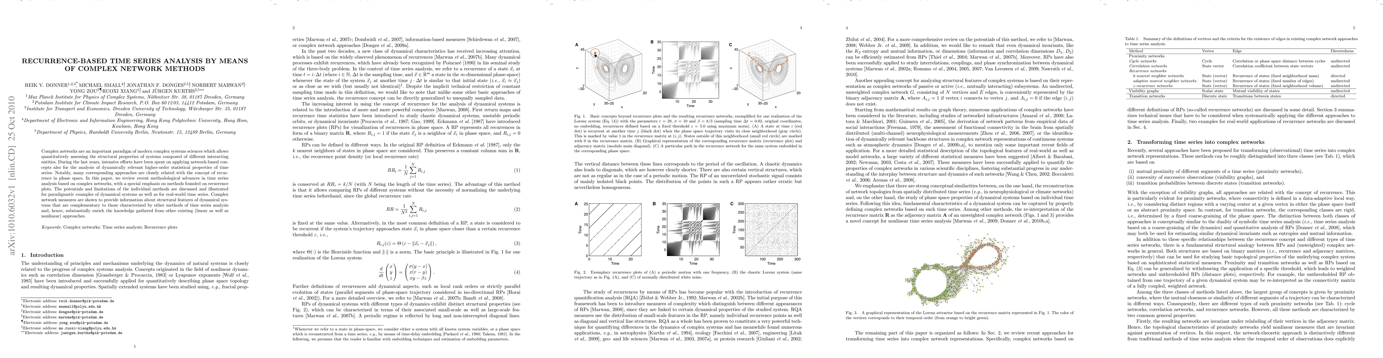 This paper reviews recent advances in time series analysis using complex network methods, focusing on recurrence plot-based approaches. It discusses the complementary insights these methods provide to traditional time series analysis, demonstrating their application to both dynamical systems and real-world data.