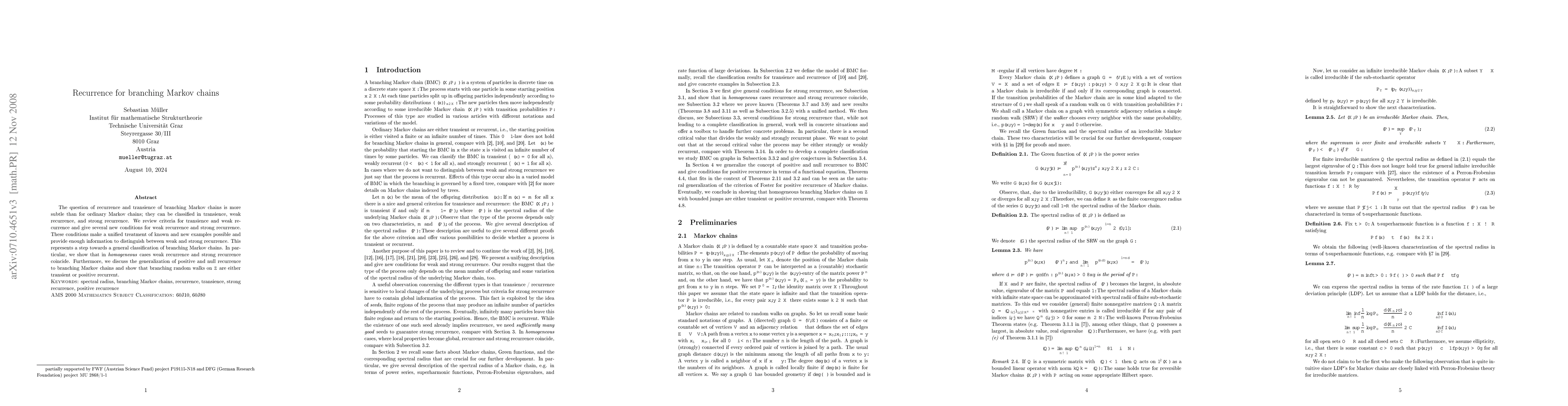 The question of recurrence and transience of branching Markov chains is more subtle than for ordinary Markov chains; they can be classified in transience, weak recurrence, and strong recurrence. We review criteria for transience and weak recurrence and give several new conditions for weak recurrence and strong recurrence. These conditions make a unified treatment of known and new examples possible and provide enough information to distinguish between weak and strong recurrence. This represents a step towards a general classification of branching Markov chains. In particular, we show that in \emph{homogeneous} cases weak recurrence and strong recurrence coincide. Furthermore, we discuss the generalization of positive and null recurrence to branching Markov chains and show that branching random walks on $\Z$ are either transient or positive recurrent.