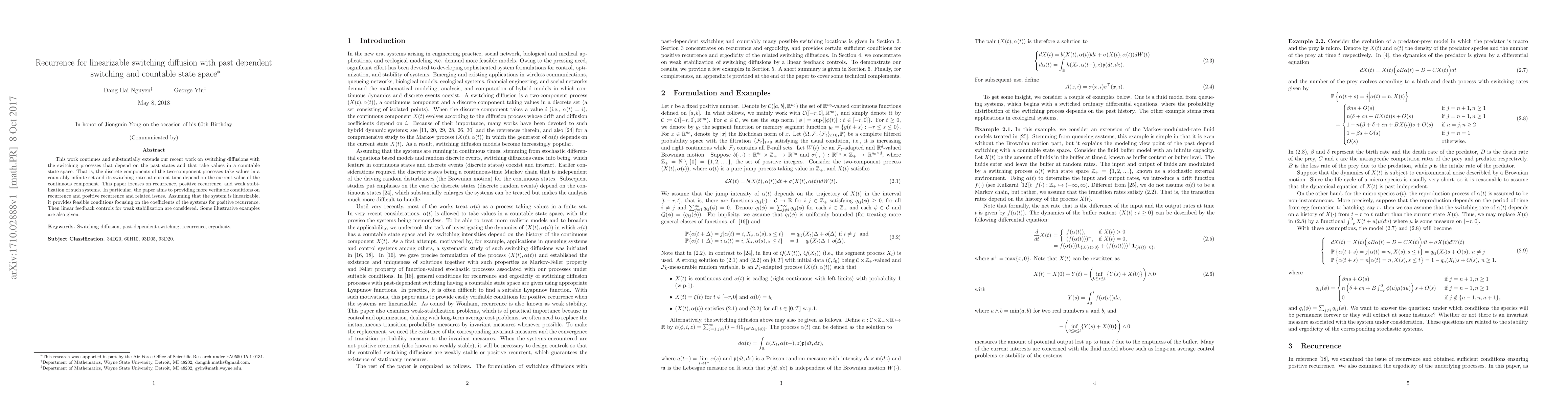 This paper extends research on switching diffusions with past-dependent switching and countable state space, focusing on recurrence, positive recurrence, and weak stabilization. It provides verifiable conditions for positive recurrence under linearizability and discusses linear feedback controls for weak stabilization, supplemented by illustrative examples.