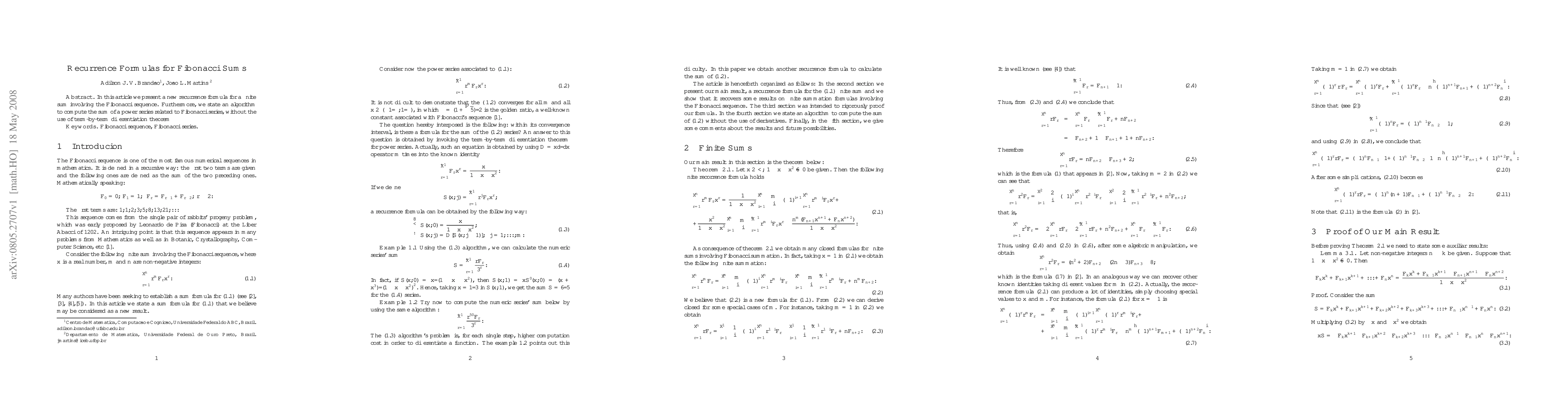 In this article we present a new recurrence formula for a finite sum involving the Fibonacci sequence. Furthermore, we state an algorithm to compute the sum of a power series related to Fibonacci series, without the use of term-by-term differentiation theorem