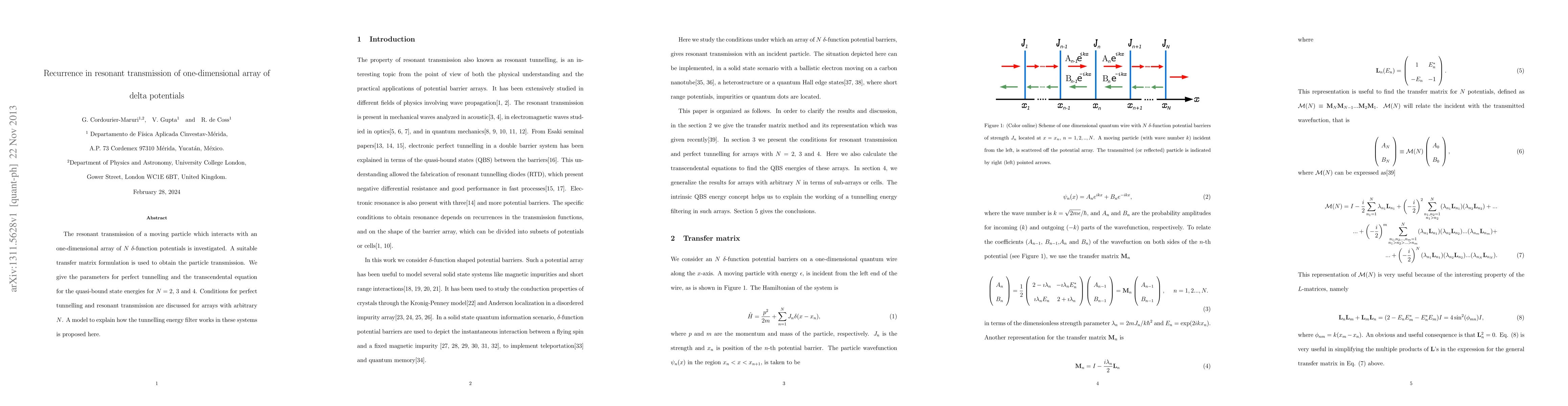 This paper investigates the resonant transmission of particles through an array of N delta-function potentials using a transfer matrix approach. It identifies conditions for perfect tunnelling and provides a model explaining the tunnelling energy filter in these systems.