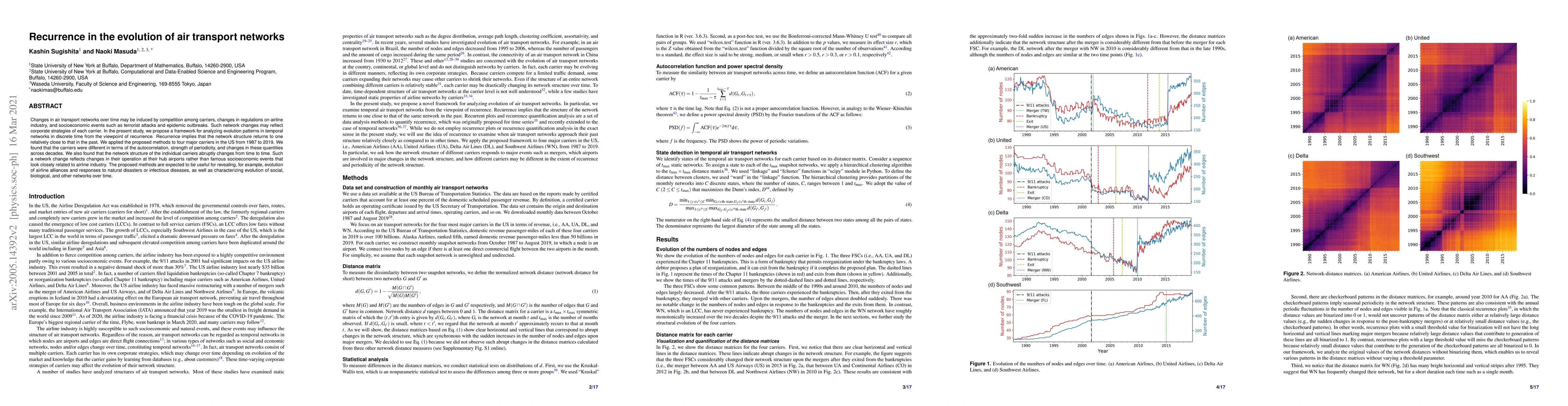 Changes in air transport networks over time may be induced by competition among carriers, changes in regulations on airline industry, and socioeconomic events such as terrorist attacks and epidemic outbreaks. Such network changes may reflect corporate strategies of each carrier. In the present study, we propose a framework for analyzing evolution patterns in temporal networks in discrete time from the viewpoint of recurrence. Recurrence implies that the network structure returns to one relatively close to that in the past. We applied the proposed methods to four major carriers in the US from 1987 to 2019. We found that the carriers were different in terms of the autocorrelation, strength of periodicity, and changes in these quantities across decades. We also found that the network structure of the individual carriers abruptly changes from time to time. Such a network change reflects changes in their operation at their hub airports rather than famous socioeconomic events that look closely related to airline industry. The proposed methods are expected to be useful for revealing, for example, evolution of airline alliances and responses to natural disasters or infectious diseases, as well as characterizing evolution of social, biological, and other networks over time.