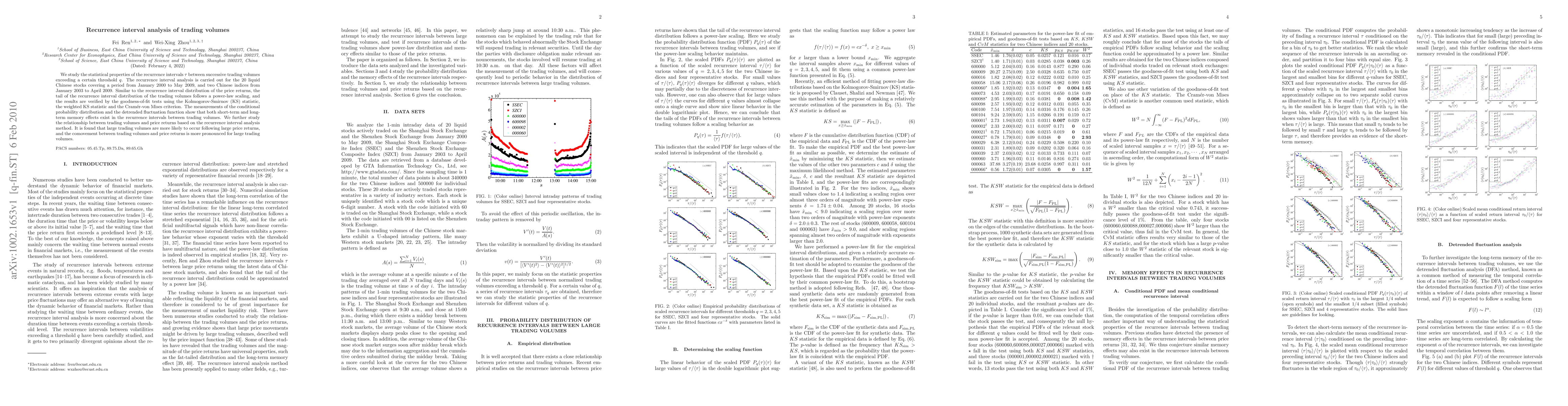 This study analyzes the statistical properties of recurrence intervals between trading volumes exceeding a threshold in 20 Chinese stocks and two indices, revealing a power-law scaling in the tail of the distribution. It finds both short-term and long-term memory effects and shows a stronger comovement between large trading volumes and large price returns.