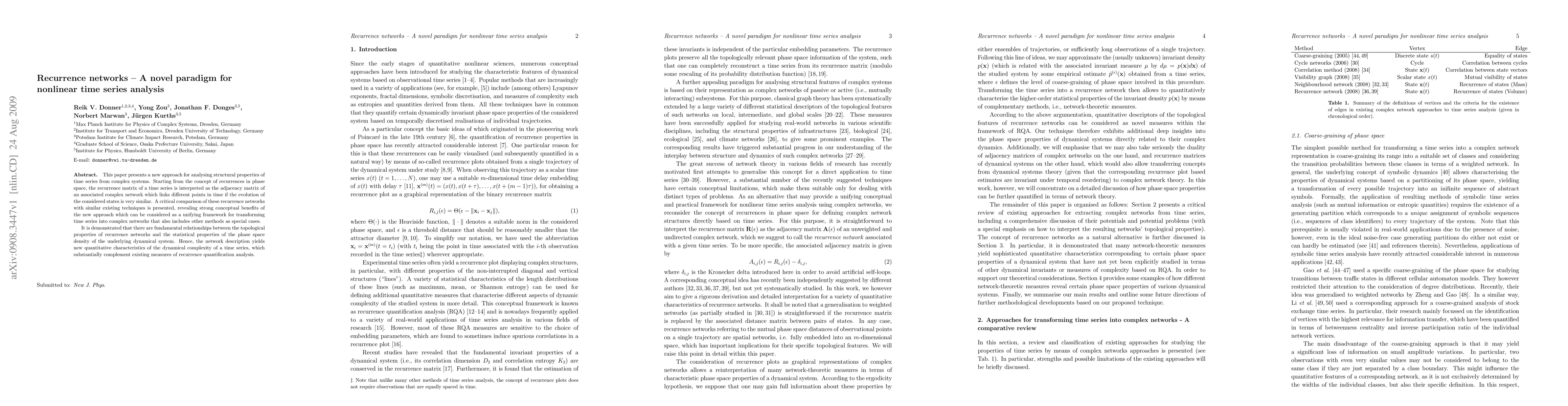 This paper introduces recurrence networks as a novel framework for analyzing nonlinear time series, transforming them into complex networks that reveal the structural properties of the underlying dynamical systems. It highlights the strong conceptual benefits of this approach over existing techniques and demonstrates fundamental links between network topology and phase space density, providing new insights into dynamical complexity.