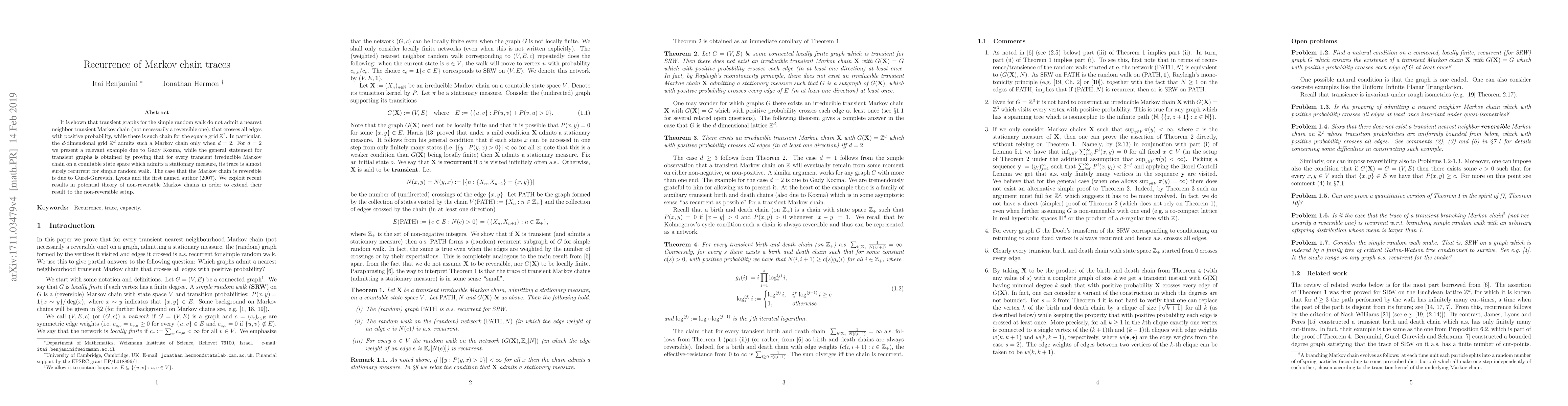 It is shown that transient graphs for the simple random walk do not admit a nearest neighbor transient Markov chain (not necessarily a reversible one), that crosses all edges with positive probability, while there is such chain for the square grid $\mathbb{Z}^2$. In particular, the $d$-dimensional grid $\mathbb{Z}^d$ admits such a Markov chain only when $d=2$. For $d=2$ we present a relevant example due to Gady Kozma, while the general statement for transient graphs is obtained by proving that for every transient irreducible Markov chain on a countable state space, which admits a stationary measure, its trace is a.s. recurrent for simple random walk. The case that the Markov chain is reversible is due to Gurel-Gurevich, Lyons and the first named author (2007). We exploit recent results in potential theory of non-reversible Markov chains in order to extend their result to the non-reversible setup.