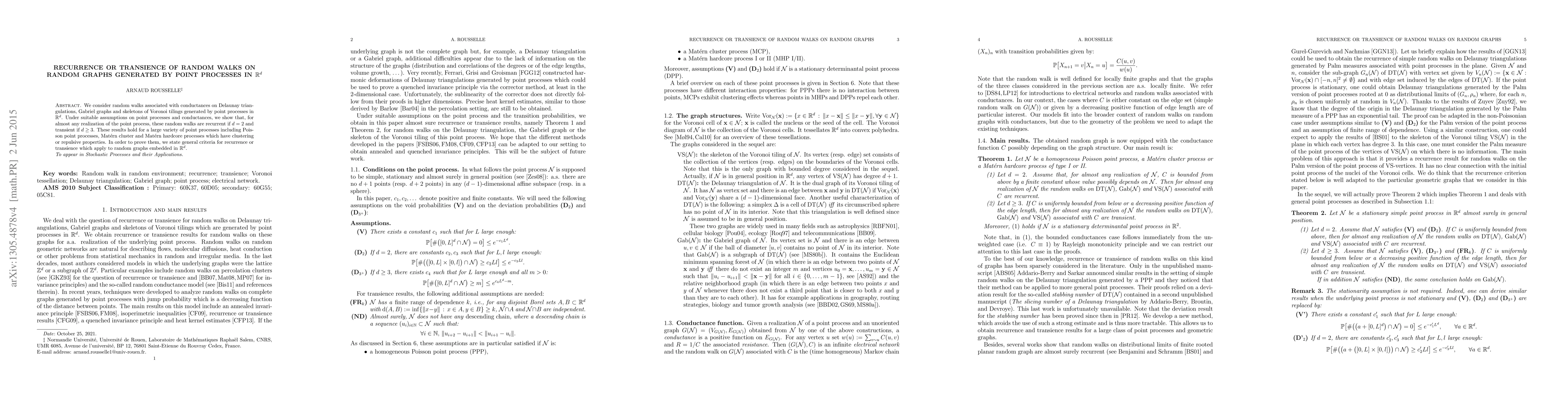 Summary: This paper examines random walks on random graphs formed by point processes in $\mathbb{R}^d$, showing they are recurrent in 2D and transient in 3D or higher dimensions under certain conditions. The findings apply to various point processes and establish criteria for determining recurrence or transience in random graphs.