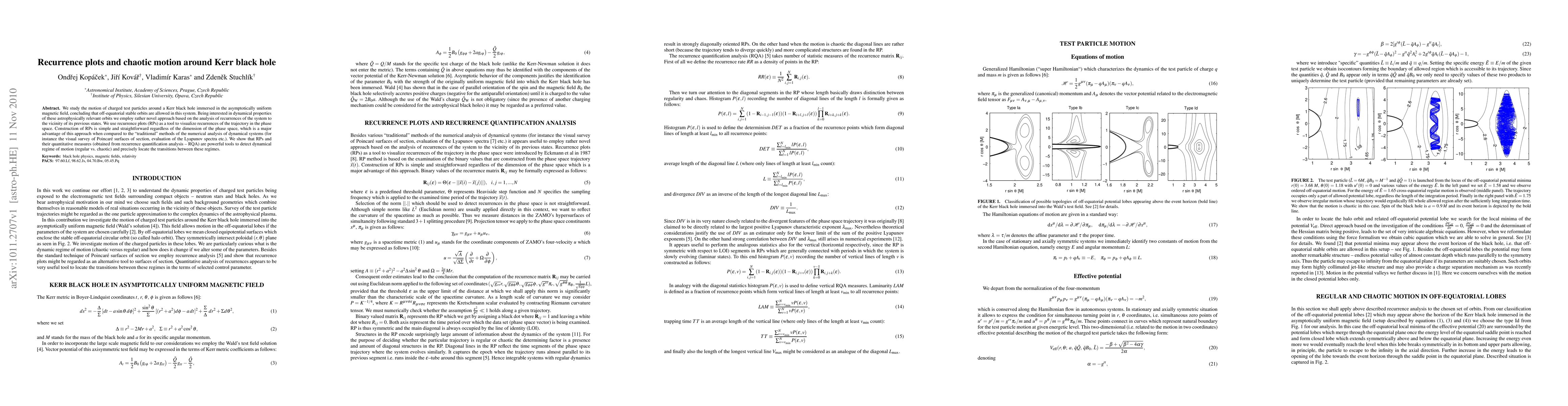 This paper investigates the motion of charged particles around a Kerr black hole in a magnetic field, revealing stable off-equatorial orbits. It employs recurrence plots to visualize and analyze the dynamical properties, demonstrating that these plots effectively distinguish between regular and chaotic motion and identify transitions between regimes.
