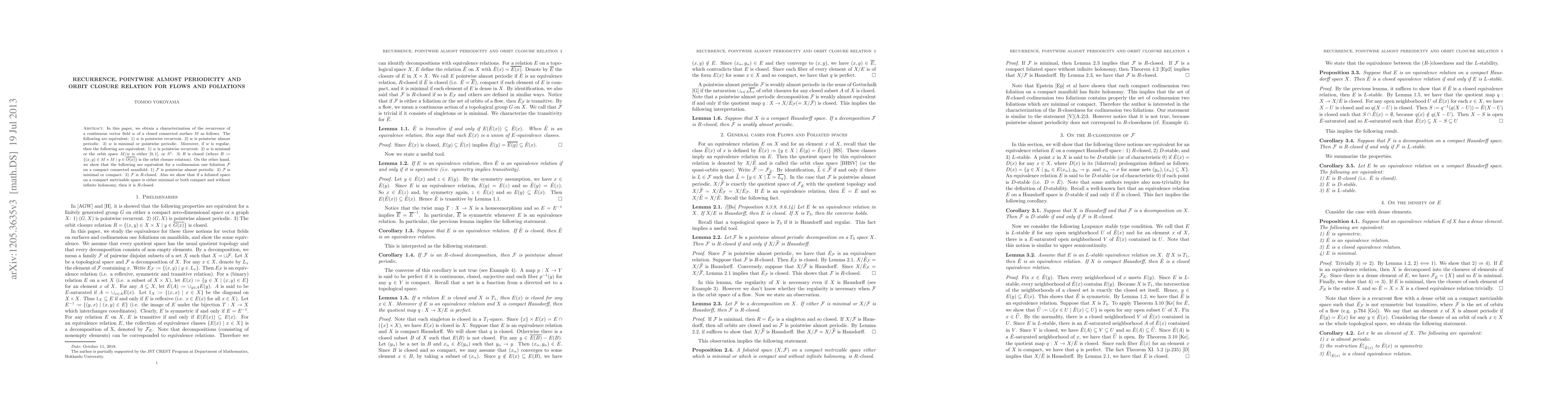 This paper presents equivalences for recurrence and pointwise almost periodicity in continuous vector fields on closed surfaces and codimension one foliations on compact manifolds. It shows that for vector fields, these properties are equivalent to minimality or periodicity, and for foliations, they correspond to minimality, compactness, or R-closedness. The study also asserts that minimal or specific-condition foliated spaces on compact metrizable spaces are R-closed.