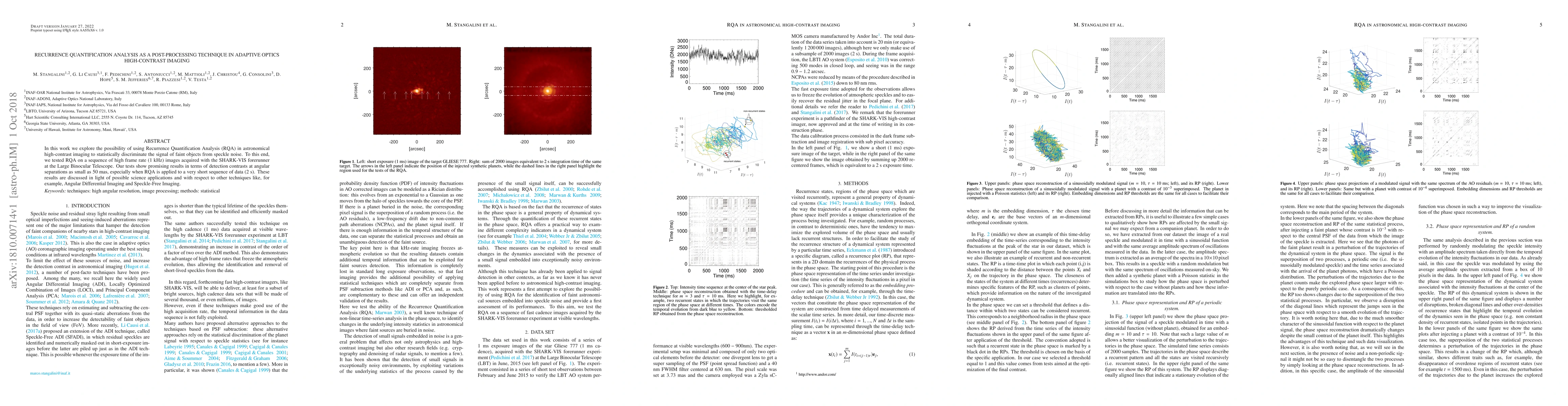 Researchers used Recurrence Quantification Analysis to detect faint objects in high-contrast astronomy images, achieving promising results with sequences as short as 2 seconds. This technique may complement existing methods like Angular Differential Imaging and Speckle-Free Imaging.