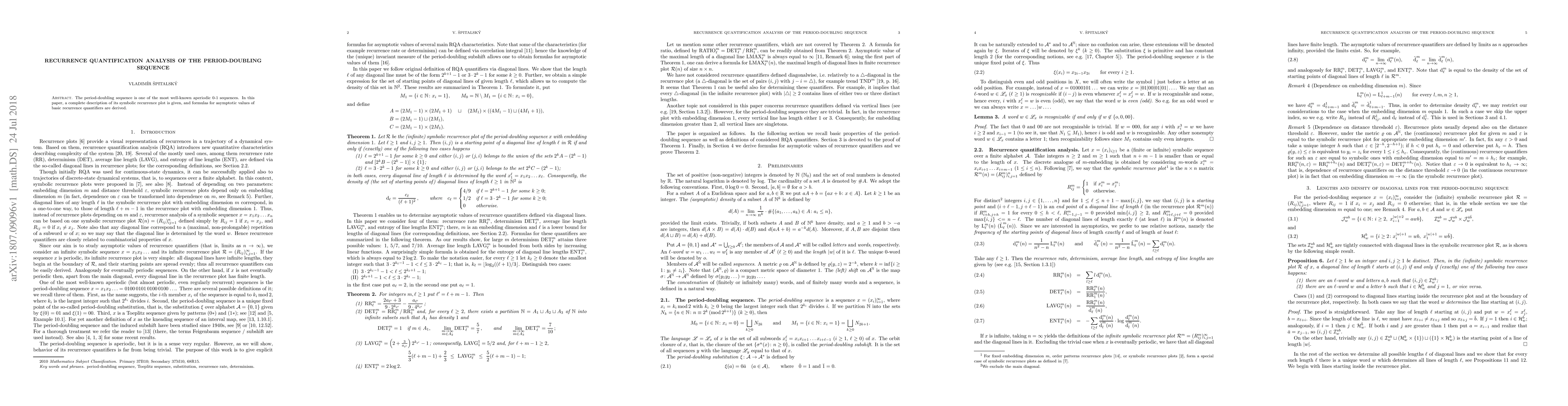 This paper provides a detailed analysis of the period-doubling sequence using recurrence quantification, presenting a comprehensive description of its symbolic recurrence plot and deriving formulas for the asymptotic values of fundamental recurrence quantifiers.