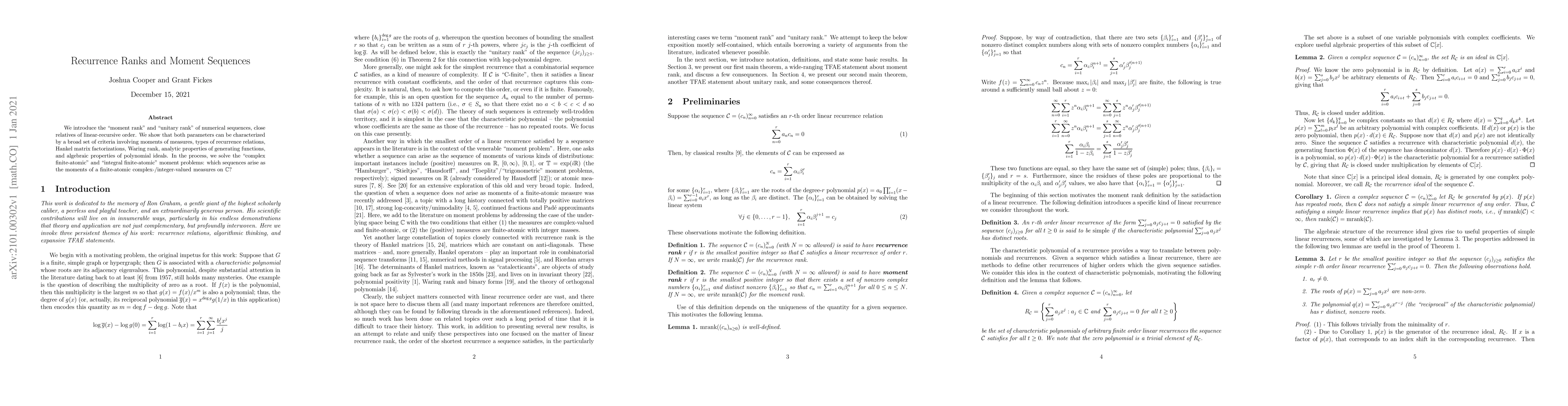 We introduce the "moment rank" and "unitary rank" of numerical sequences, close relatives of linear-recursive order. We show that both parameters can be characterized by a broad set of criteria involving moments of measures, types of recurrence relations, Hankel matrix factorizations, Waring rank, analytic properties of generating functions, and algebraic properties of polynomial ideals. In the process, we solve the "complex finite-atomic" and "integral finite-atomic" moment problems: which sequences arise as the moments of a finite-atomic complex-/integer-valued measures on $\mathbb{C}$?