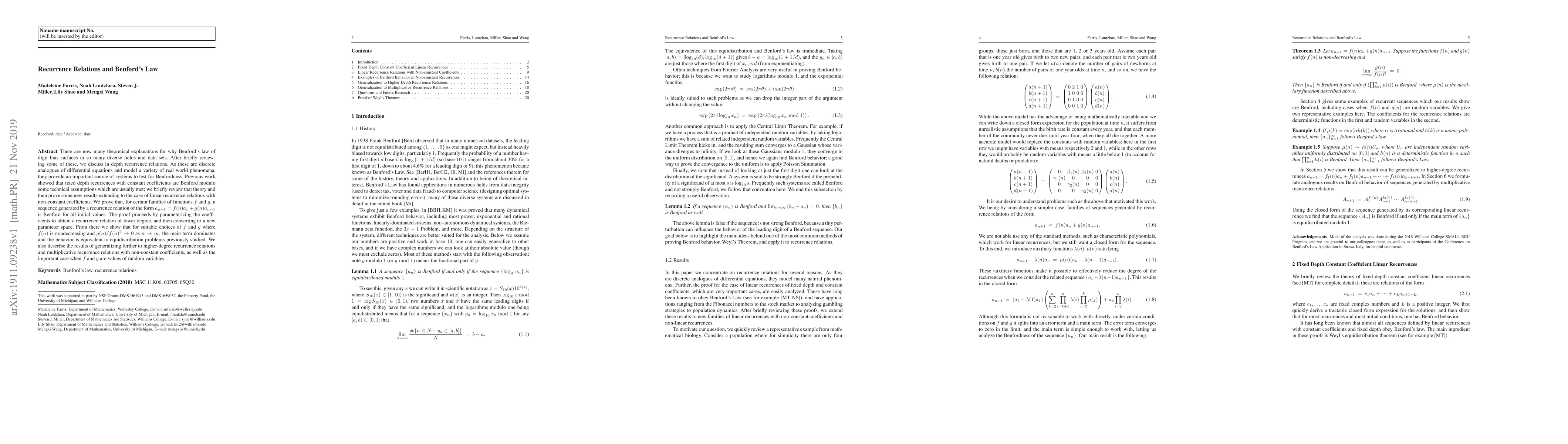 This paper explores the connection between recurrence relations and Benford's Law, proving that sequences generated by linear recurrence relations with non-constant coefficients can exhibit Benfordness under specific conditions. The study extends previous results on fixed depth recurrences and discusses the implications for equidistribution problems.