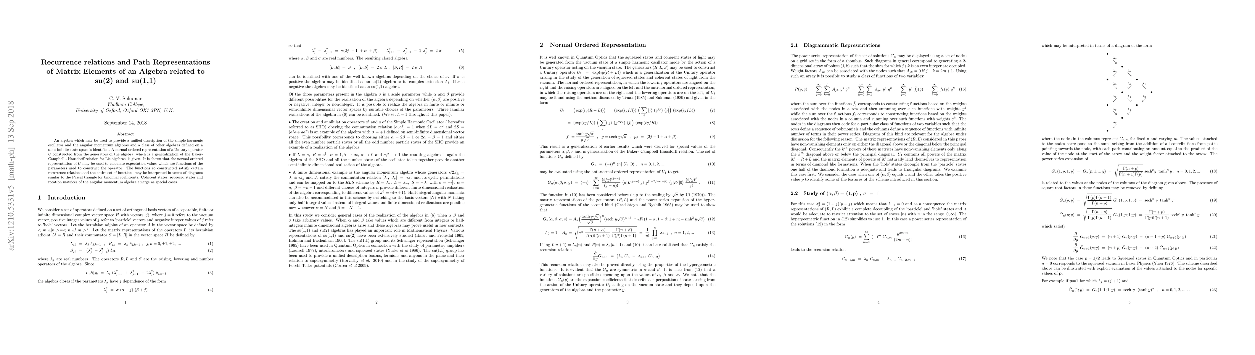 It is shown that a SU(1,1) algebra may be used to provide a unified description of the simple hamonic oscillator and the angular momentum algebras and a class of other semi-infinite algebras. A normal ordered representation of a Unitary operator $U$ constructed from the generators of a SU(1,1) algebra, which is a generalisation of the Baker- Campbell - Hausdorff relation for Lie algebras, is given. It is shown that the normal ordered representatiion of $U$ may be used to calculate expectation values which are functions of the parameters used to construct the operator. The functions so constructed satisfy certain recurrence relations and the entire set of functions may be interpreted in terms of diagrams similar to the Pascal triangle for binomial coefficients. Coherent states, squeezed states and rotation matrices of the angular momentum algebra emerge as special cases.