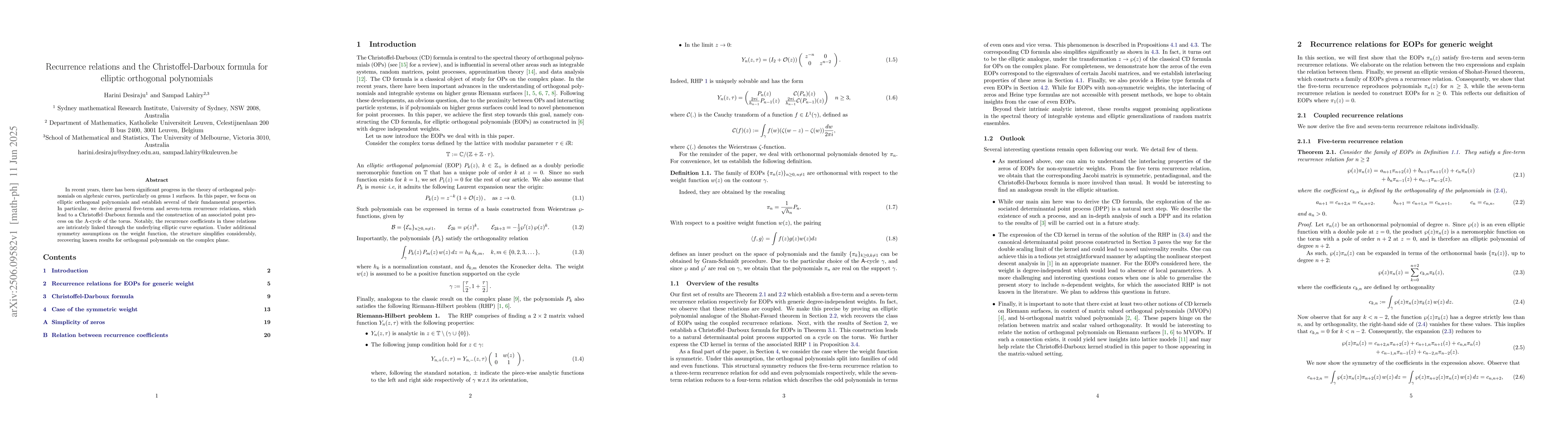 In recent years, there has been significant progress in the theory of orthogonal polynomials on algebraic curves, particularly on genus 1 surfaces. In this paper, we focus on elliptic orthogonal polynomials and establish several of their fundamental properties. In particular, we derive general five-term and seven-term recurrence relations, which lead to a Christoffel-Darboux formula and the construction of an associated point process on the A-cycle of the torus. Notably, the recurrence coefficients in these relations are intricately linked through the underlying elliptic curve equation. Under additional symmetry assumptions on the weight function, the structure simplifies considerably, recovering known results for orthogonal polynomials on the complex plane.