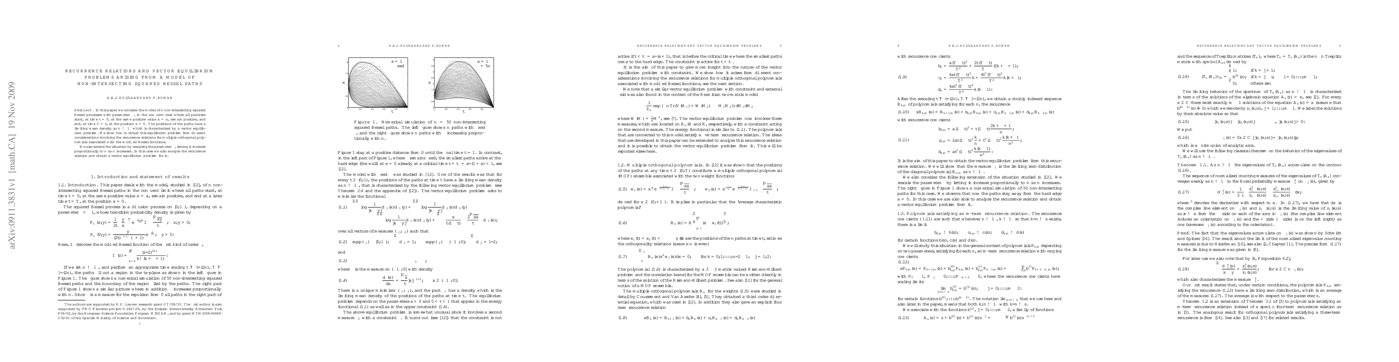In this paper we consider the model of $n$ non-intersecting squared Bessel processes with parameter $\alpha$, in the confluent case where all particles start, at time $t=0$, at the same positive value $x=a$, remain positive, and end, at time $T=t$, at the position $x=0$. The positions of the paths have a limiting mean density as $n\to\infty$ which is characterized by a vector equilibrium problem. We show how to obtain this equilibrium problem from different considerations involving the recurrence relations for multiple orthogonal polynomials associated with the modified Bessel functions. We also extend the situation by rescaling the parameter $\alpha$, letting it increase proportionally to $n$ as $n$ increases. In this case we also analyze the recurrence relation and obtain a vector equilibrium problem for it.