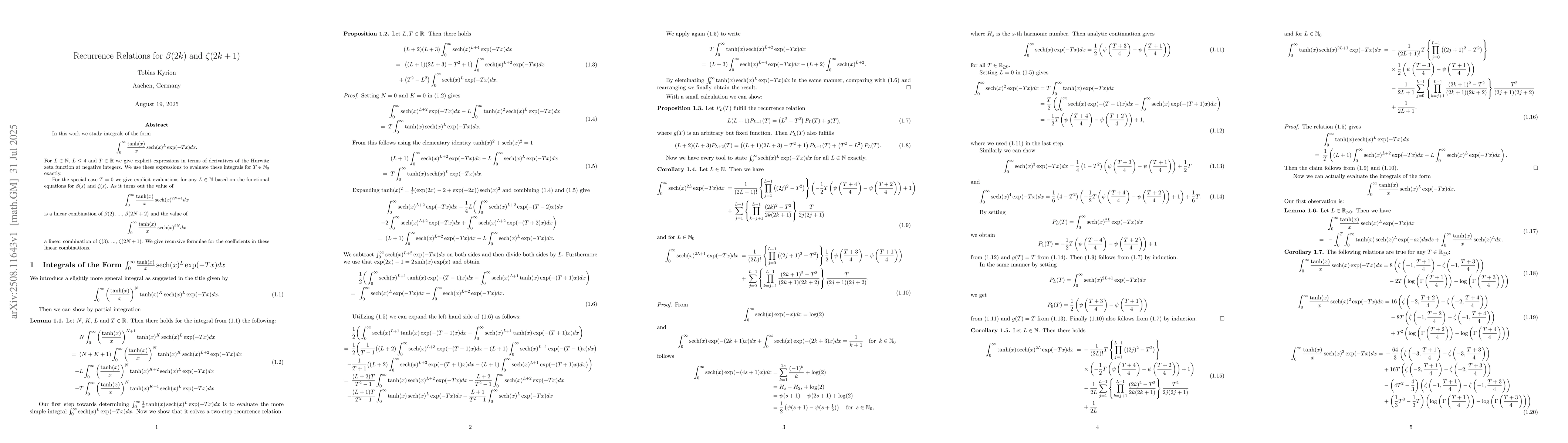 In this work we study integrals of the form $\int_{0}^{\infty}\frac{\tanh(x)}{x}\mathrm{sech}(x)^{L}\exp(-Tx)dx$. For $L \in \mathbb{N}$, $L \leq 4$ and $T \in \mathbb{R}$ we give explicit expressions in terms of derivatives of the Hurwitz zeta function at negative integers. We use these expressions to evaluate these integrals for $T \in \mathbb{N}_{0}$ exactly. For the special case $T = 0$ we give explicit evaluations for any $L \in \mathbb{N}$ based on the functional equations for $\beta(s)$ and $\zeta(s)$. As it turns out the value of $\int_{0}^{\infty}\frac{\tanh(x)}{x}\mathrm{sech}(x)^{2N + 1}dx$ is a linear combination of $\beta(2)$, ..., $\beta(2N + 2)$ and the value of $\int_{0}^{\infty}\frac{\tanh(x)}{x}\mathrm{sech}(x)^{2N}dx$ a linear combination of $\zeta(3)$, ..., $\zeta(2N + 1)$. We give recursive formulae for the coefficients in these linear combinations.