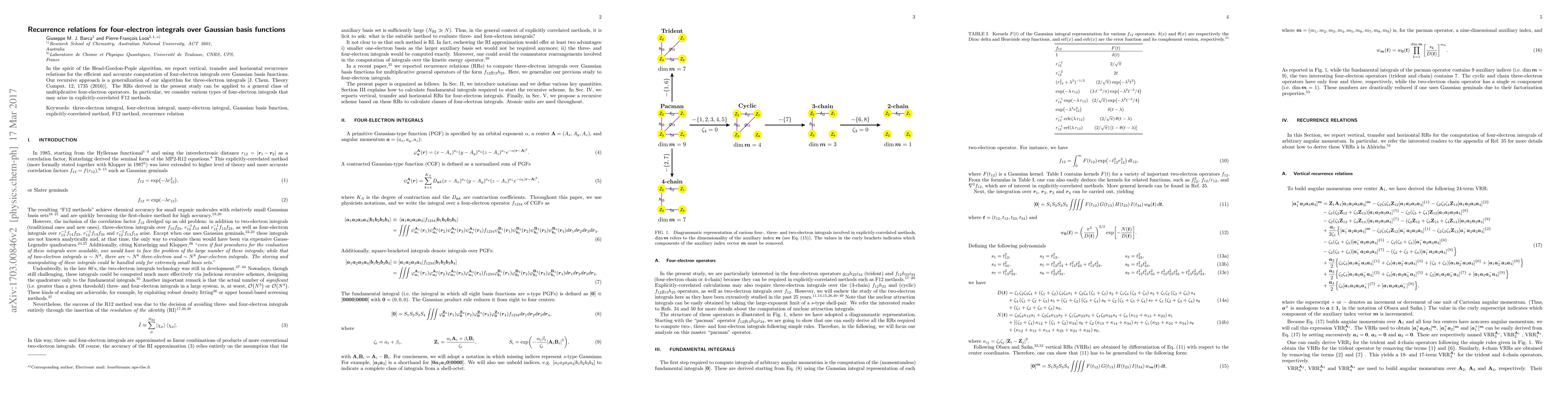 This paper presents vertical, transfer, and horizontal recurrence relations for computing four-electron integrals over Gaussian basis functions, extending previous methods for three-electron integrals. These recursive relations are applicable to a broad class of four-electron operators, especially those used in explicitly-correlated F12 methods.