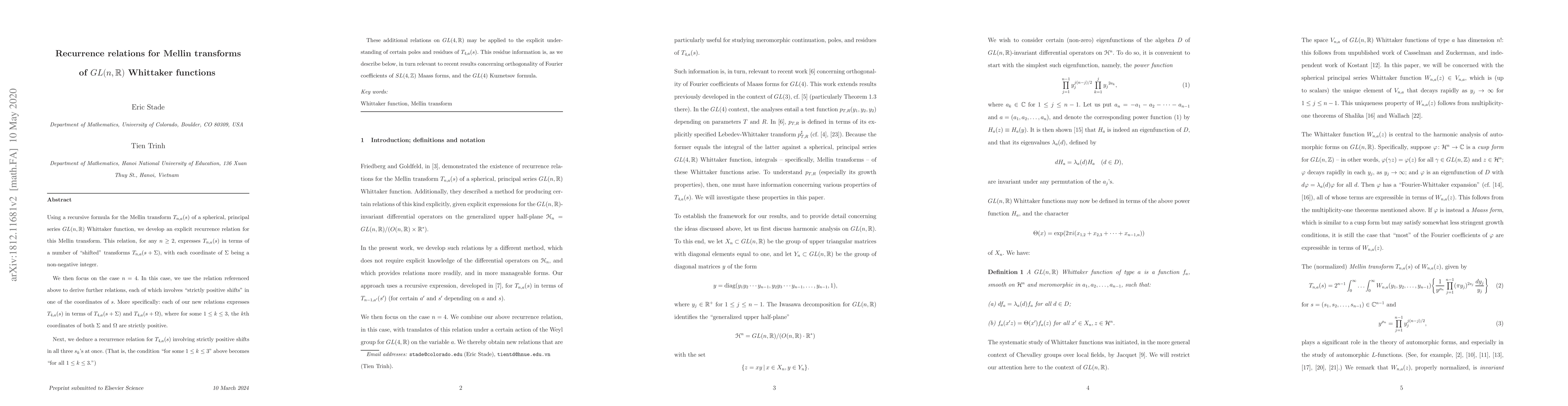 This paper develops explicit recurrence relations for the Mellin transforms of $GL(n,\mathbb{R})$ Whittaker functions, particularly focusing on $n=4$. It provides a recursive formula for $T_{n,a}(s)$ and deduces relations involving strictly positive shifts in all coordinates of $s$. These relations are relevant for understanding poles and residues, with applications to orthogonality of Fourier coefficients and the $GL(4)$ Kuznetsov formula.
