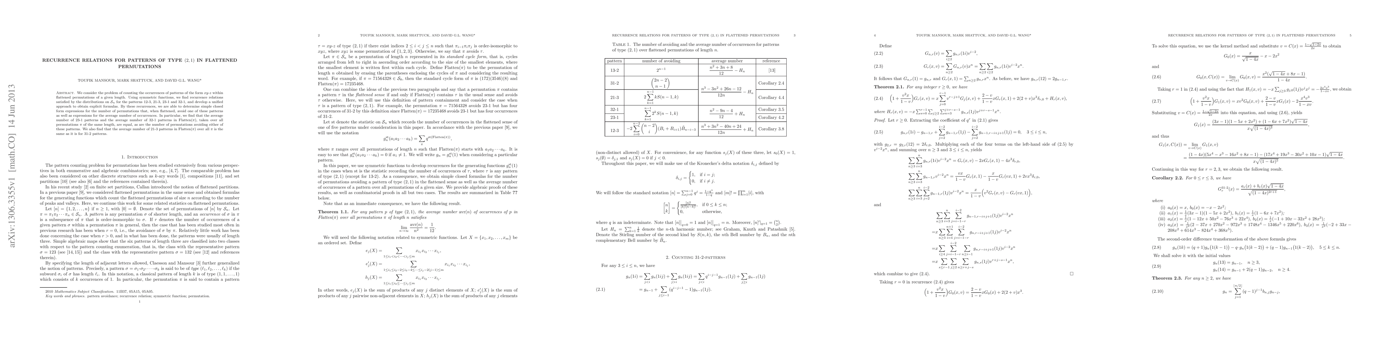 This paper develops recurrence relations for counting $(2,1)$-type patterns in flattened permutations, deriving explicit formulas for the number of permutations avoiding these patterns and their average occurrences. It reveals equalities in average occurrences and avoidance counts for specific patterns.