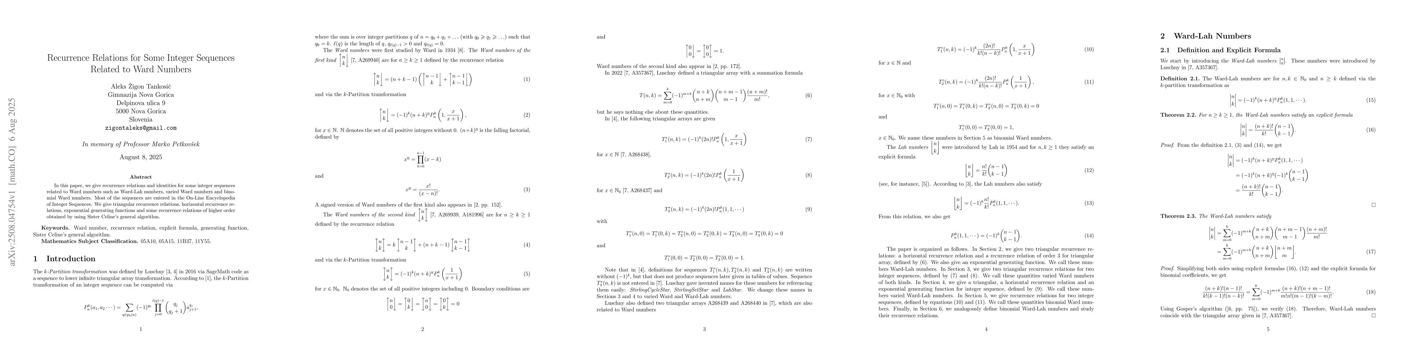 In this paper, we give recurrence relations and identities for some integer sequences related to Ward numbers such as Ward-Lah numbers, varied Ward numbers and binomial Ward numbers. Most of the sequences are entered in the On-Line Encyclopedia of Integer Sequences. We give triangular recurrence relations, horizontal recurrence relations, exponential generating functions and some recurrence relations of higher order obtained by using Sister Celine's general algorithm.