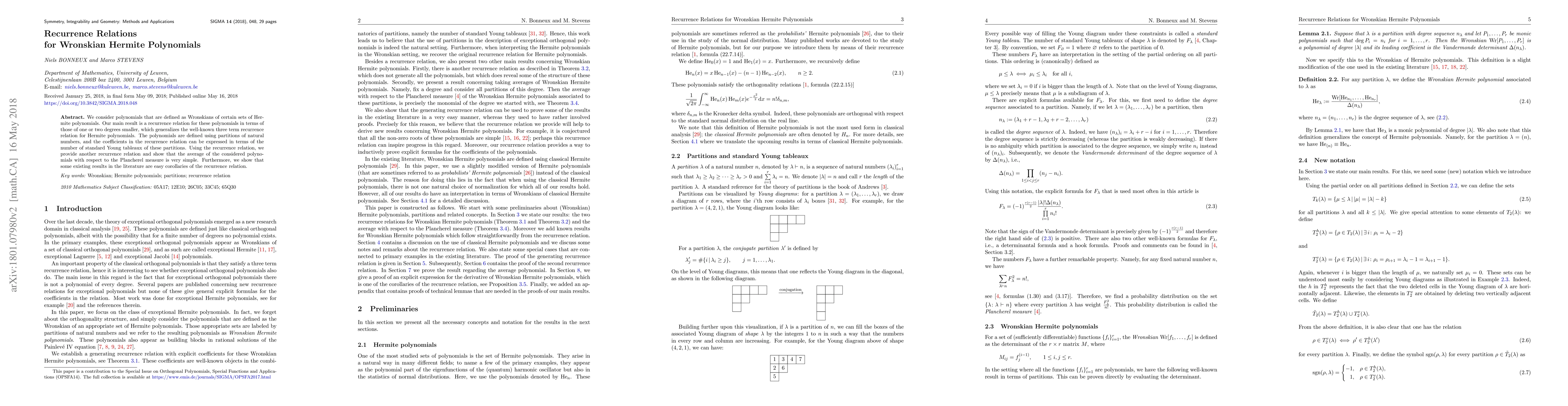 This paper derives a recurrence relation for Wronskian Hermite polynomials, generalizing the standard three-term recurrence for Hermite polynomials. The coefficients in the recurrence are linked to the number of standard Young tableaux of partitions of natural numbers, and it simplifies the average of these polynomials with respect to the Plancherel measure.