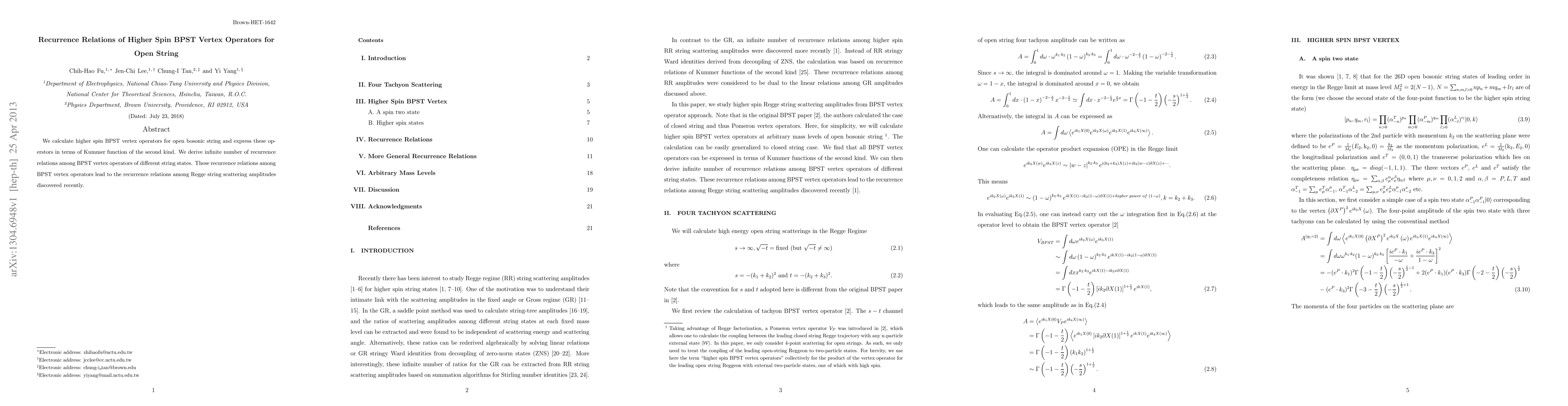 This research calculates higher spin BPST vertex operators for open bosonic strings and expresses them in terms of Kummer functions. It also derives an infinite set of recurrence relations among these operators, which correlate with recently discovered recurrence relations in Regge string scattering amplitudes.
