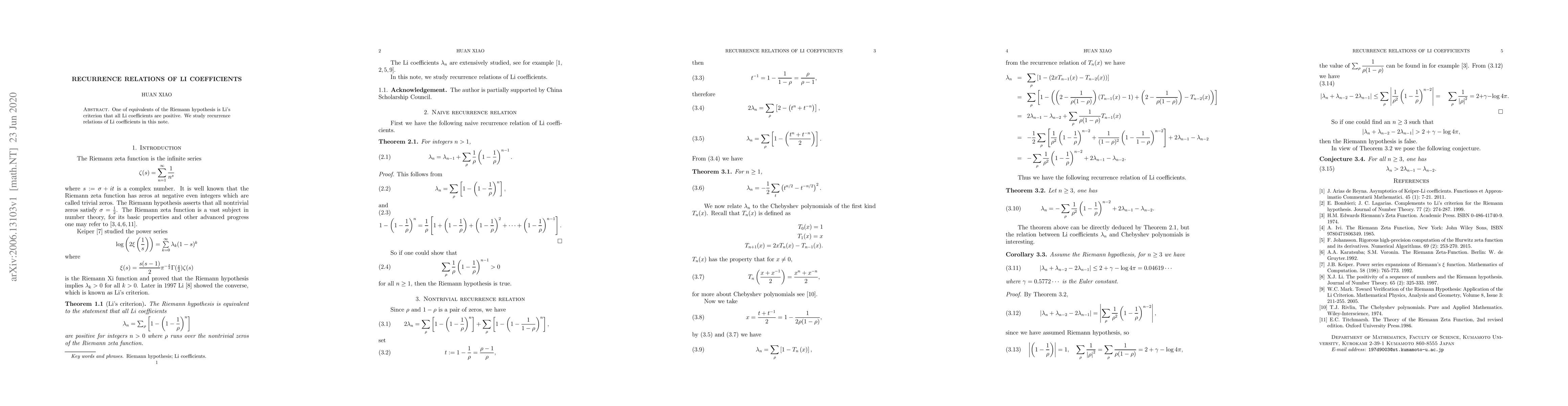 One of equivalents of the Riemann hypothesis is Li's criterion that all Li coefficients are positive. We study recurrence relations of Li coefficients in this note.