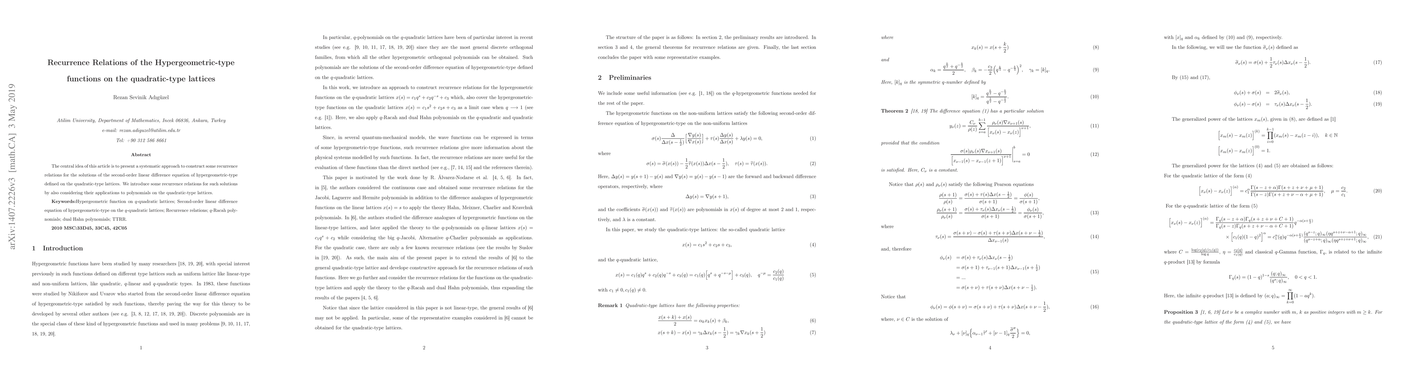 The central idea of this article is to present a systematic approach to construct some recurrence relations for the solutions of the second-order linear difference equation of hypergeometric-type defined on the quadratic-type lattices. We introduce some recurrence relations for such solutions by also considering their applications to polynomials on the quadratic-type lattices.