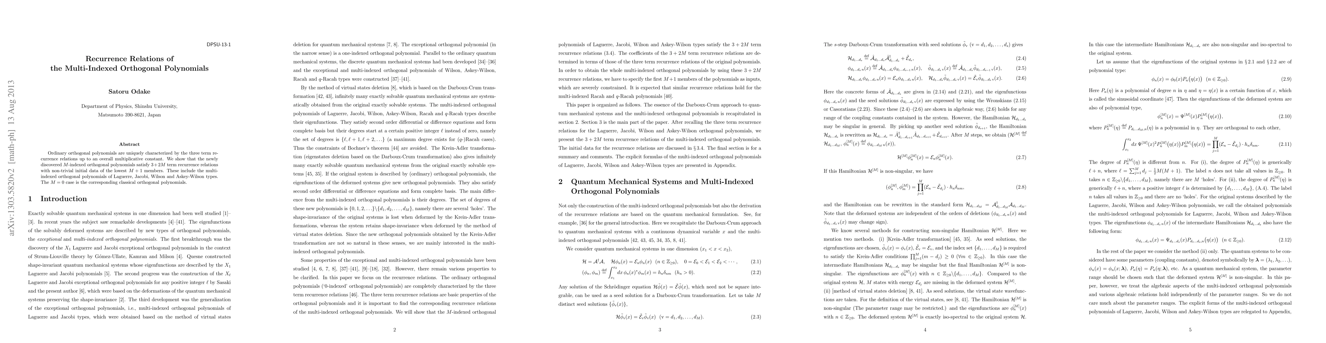 This paper demonstrates that multi-indexed orthogonal polynomials, including those of Laguerre, Jacobi, Wilson, and Askey-Wilson types, follow 3+2M term recurrence relations with specific initial conditions for the lowest M+1 members, contrasting with the three-term recurrence of classical orthogonal polynomials (M=0).