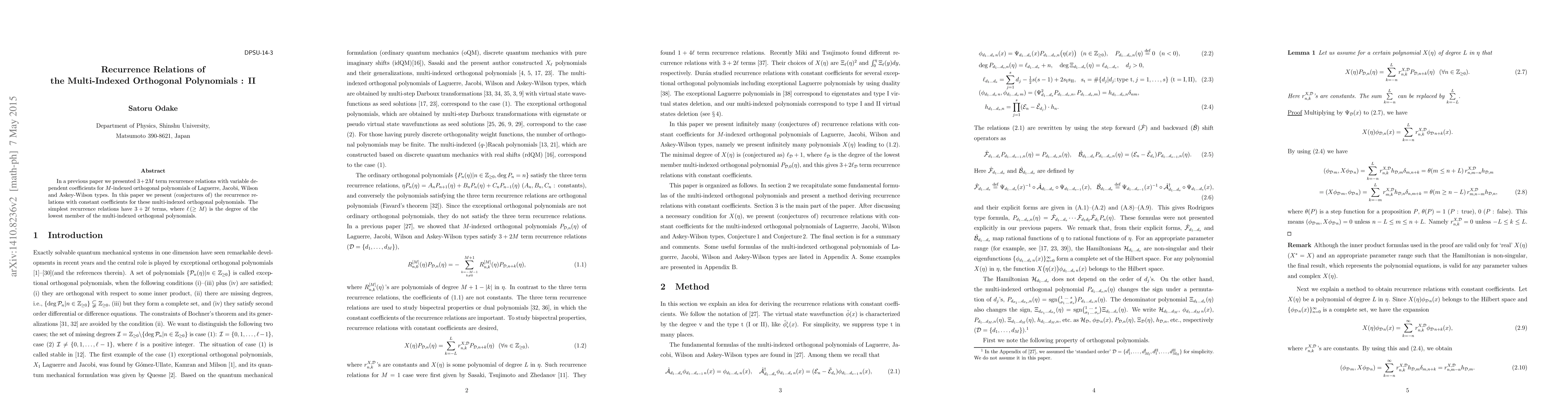 In a previous paper we presented $3+2M$ term recurrence relations with variable dependent coefficients for $M$-indexed orthogonal polynomials of Laguerre, Jacobi, Wilson and Askey-Wilson types. In this paper we present (conjectures of) the recurrence relations with constant coefficients for these multi-indexed orthogonal polynomials. The simplest recurrence relations have $3+2\ell$ terms, where $\ell (\geq M)$ is the degree of the lowest member of the multi-indexed orthogonal polynomials.