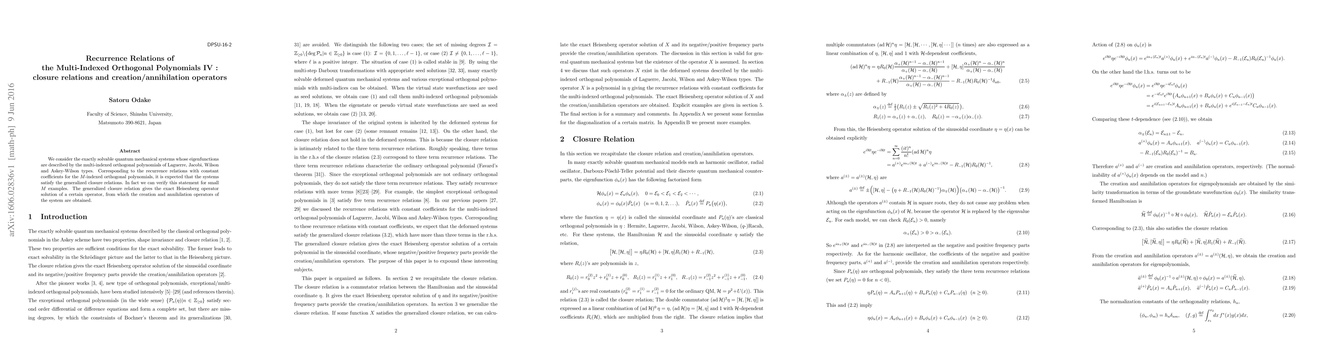 The paper introduces and discusses generalized closure relations for multi-indexed orthogonal polynomials, providing a method to derive exact Heisenberg operator solutions and corresponding creation/annihilation operators for quantum systems.