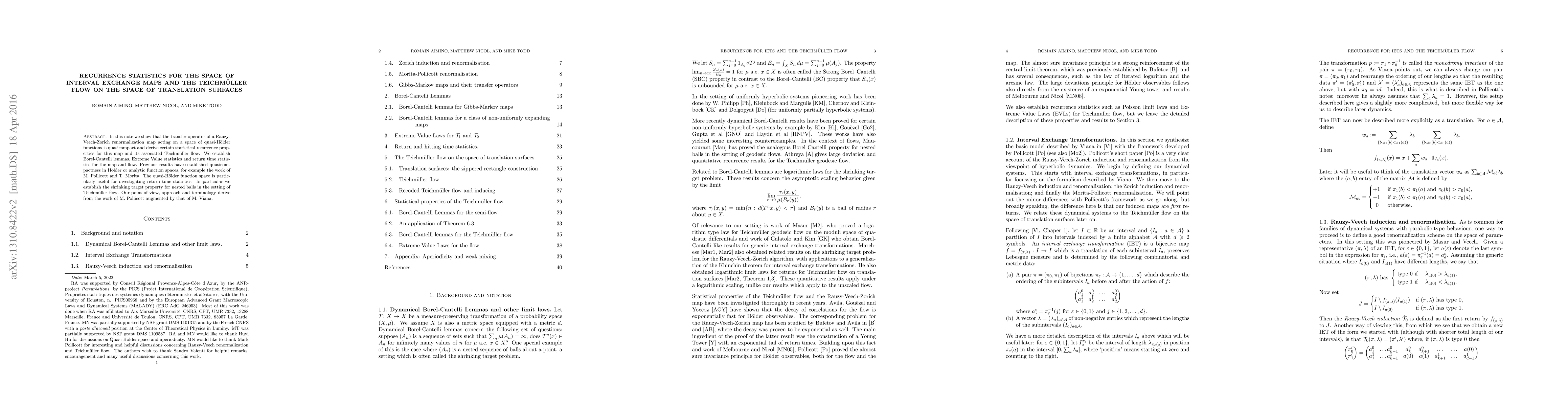 In this note we show that the transfer operator of a Rauzy-Veech-Zorich renormalization map acting on a space of quasi-H\"older functions is quasicompact and derive certain statistical recurrence properties for this map and its associated Teichm\"uller flow. We establish Borel-Cantelli lemmas, Extreme Value statistics and return time statistics for the map and flow. Previous results have established quasicompactness in H\"older or analytic function spaces, for example the work of M. Pollicott and T. Morita. The quasi-H\"older function space is particularly useful for investigating return time statistics. In particular we establish the shrinking target property for nested balls in the setting of Teichm\"uller flow. Our point of view, approach and terminology derives from the work of M. Pollicott augmented by that of M. Viana.