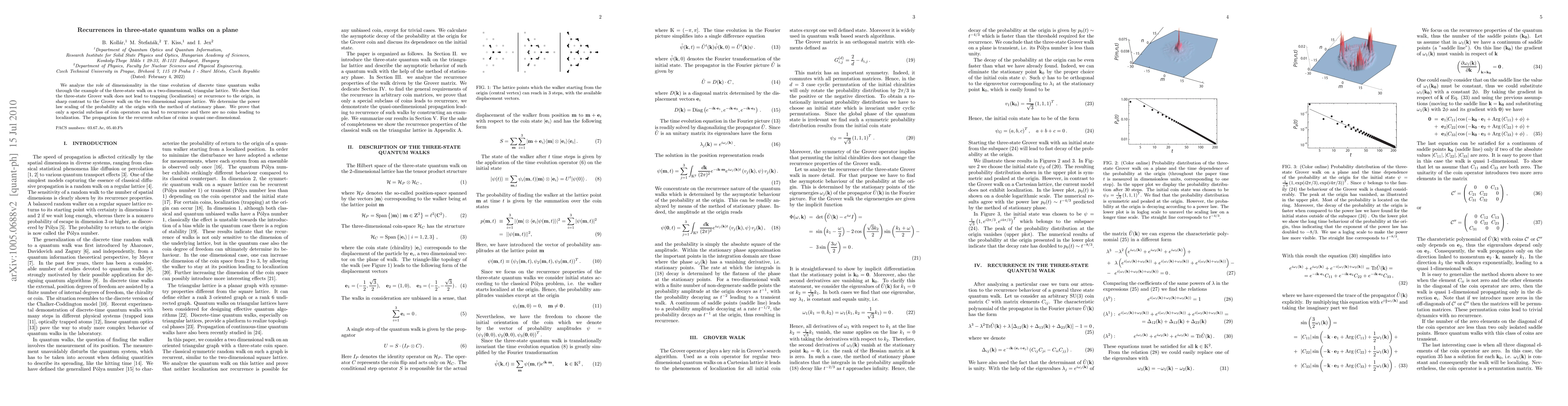 We analyze the role of dimensionality in the time evolution of discrete time quantum walks through the example of the three-state walk on a two-dimensional, triangular lattice. We show that the three-state Grover walk does not lead to trapping (localization) or recurrence to the origin, in sharp contrast to the Grover walk on the two dimensional square lattice. We determine the power law scaling of the probability at the origin with the method of stationary phase. We prove that only a special subclass of coin operators can lead to recurrence and there are no coins leading to localization. The propagation for the recurrent subclass of coins is quasi one-dimensional.