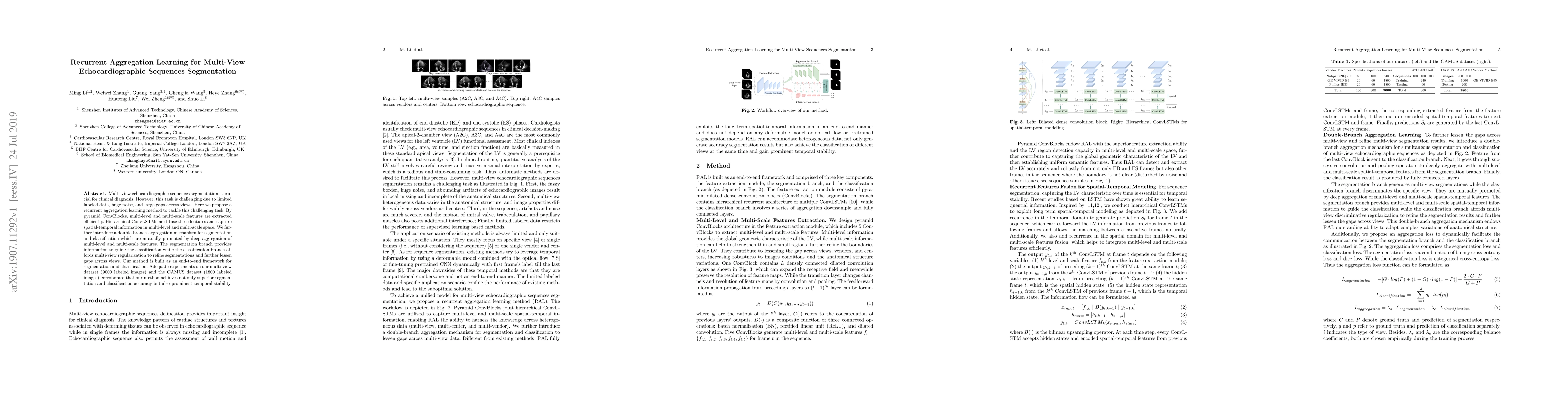 This paper proposes a recurrent aggregation learning method for segmenting multi-view echocardiographic sequences, utilizing pyramid ConvBlocks and hierarchical ConvLSTMs to extract and fuse multi-level and multi-scale features. The double-branch aggregation mechanism enhances segmentation and classification through mutual promotion, achieving superior accuracy and temporal stability on two datasets.