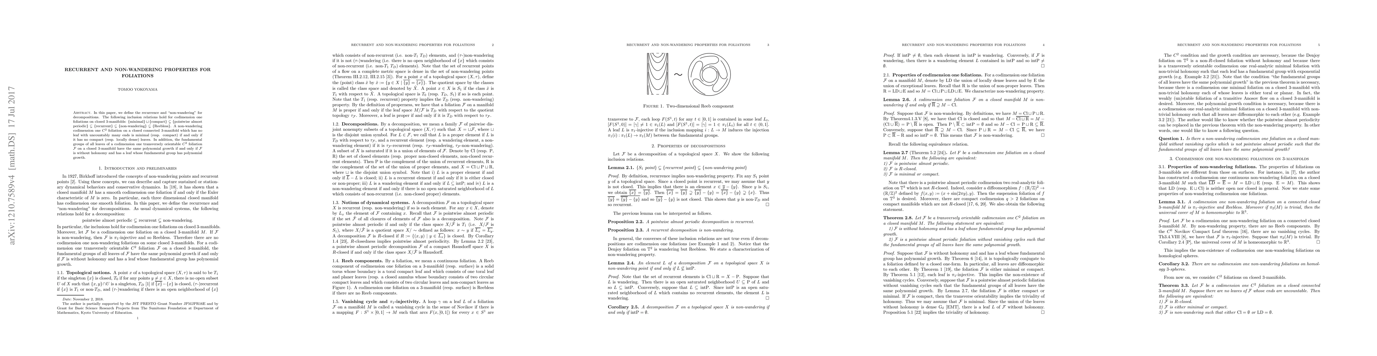 This paper explores recurrence and non-wandering properties for codimension one foliations on closed 3-manifolds, establishing inclusion relations and conditions for minimality and compactness. It concludes that a non-wandering foliation is minimal or compact if it lacks certain types of leaves, and that polynomial growth in the fundamental groups of all leaves indicates the absence of holonomy and specific growth properties in the foliation itself.