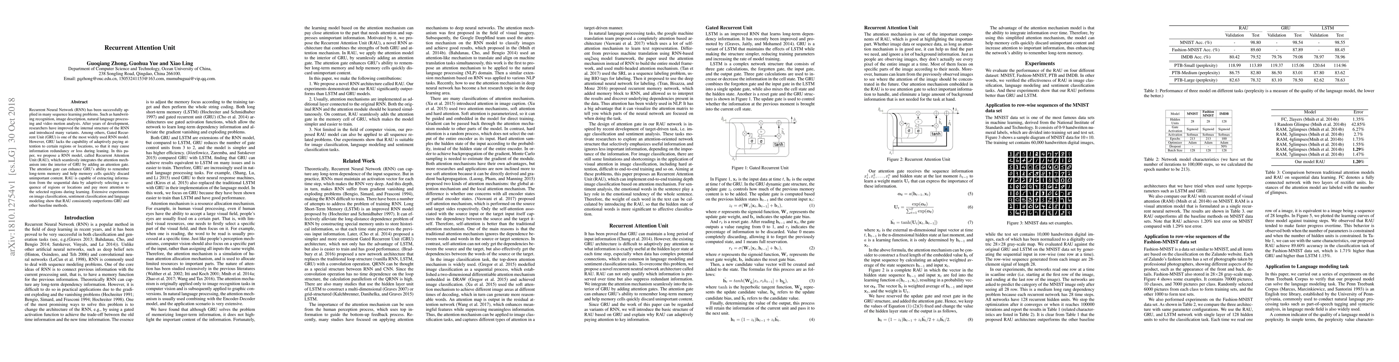 The paper proposes the Recurrent Attention Unit (RAU), a RNN model that integrates an attention mechanism into the Gated Recurrent Unit (GRU) to enhance memory retention and discard irrelevant information, achieving superior performance in image classification, sentiment classification, and language modeling compared to GRU and other baselines.