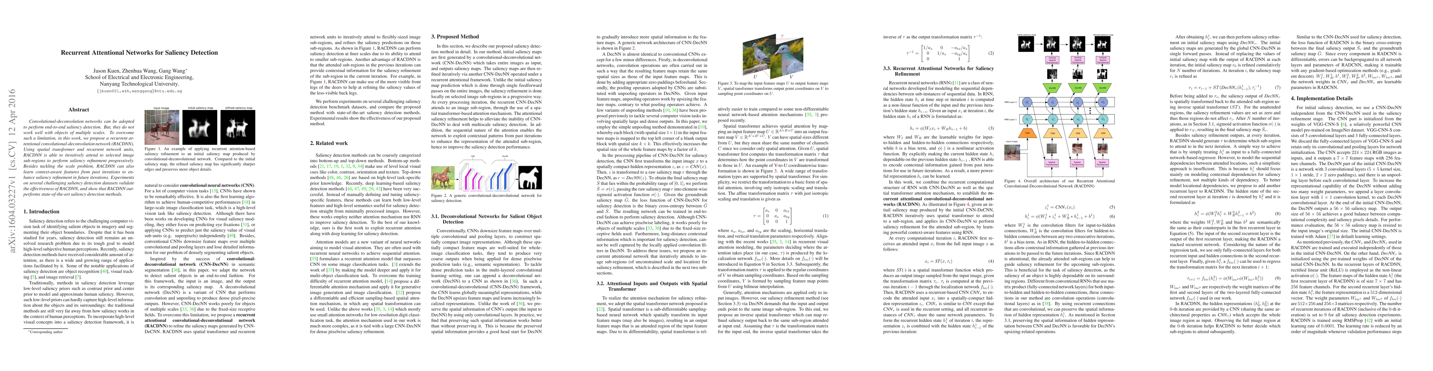 This paper proposes a recurrent attentional convolutional-deconvolution network (RACDNN) to enhance saliency detection, especially for objects of multiple scales. It uses spatial transformer and recurrent units to iteratively refine saliency by focusing on selected image sub-regions, outperforming state-of-the-art methods on various datasets.
