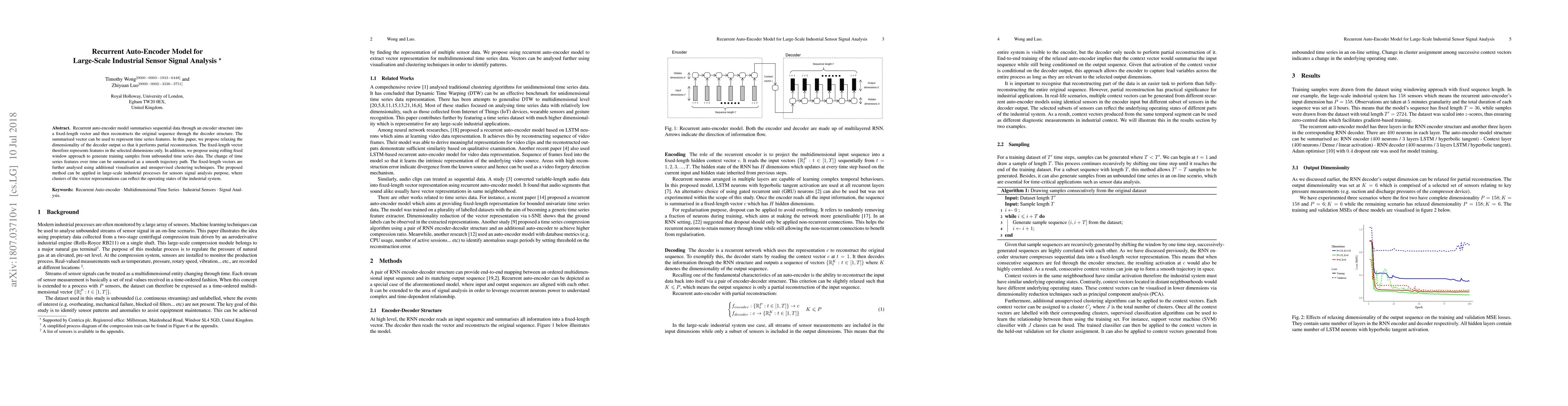 This paper proposes a recurrent auto-encoder model for summarizing large-scale industrial sensor signal data, utilizing partial reconstruction and rolling fixed windows for training. The model's fixed-length vector representations are analyzed for feature visualization and clustering to identify operating states of industrial systems.