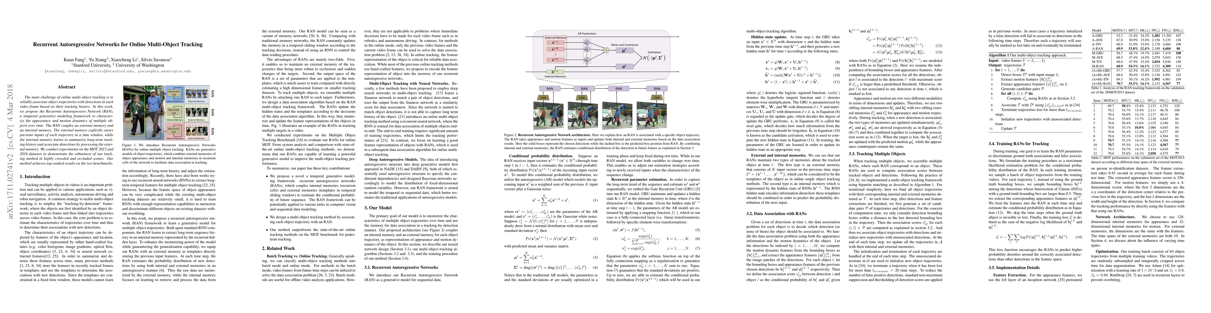 The paper proposes the Recurrent Autoregressive Network (RAN) to improve online multi-object tracking by modeling object appearance and motion dynamics using an external and internal memory system. Experiments on MOT 2015 and 2016 datasets show the method's effectiveness in crowded and occluded environments, achieving top results in benchmarks.