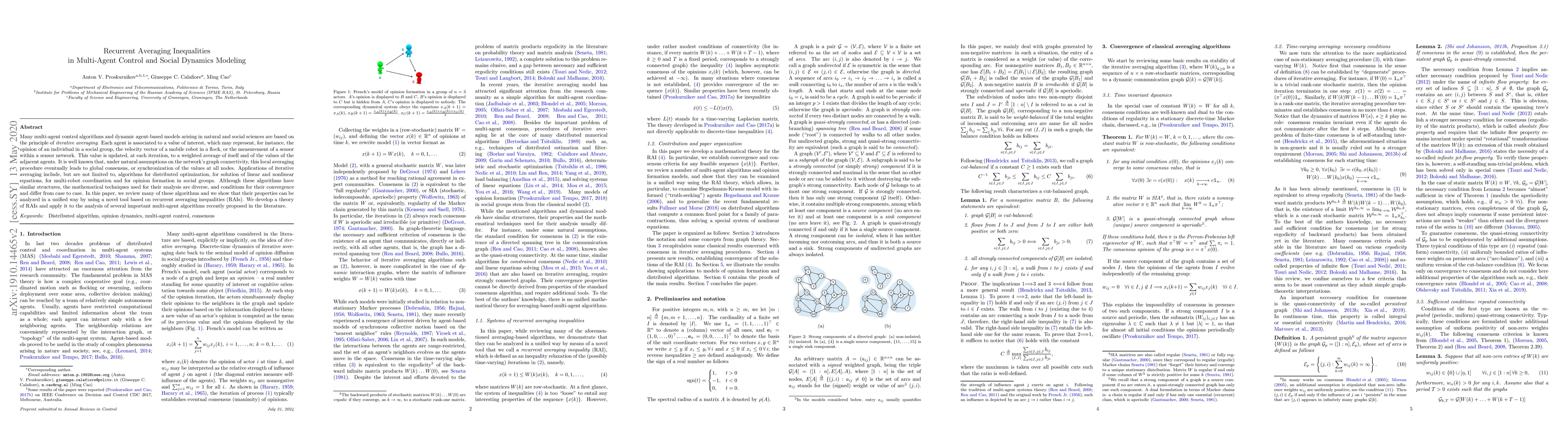 Many multi-agent control algorithms and dynamic agent-based models arising in natural and social sciences are based on the principle of iterative averaging. Each agent is associated to a value of interest, which may represent, for instance, the opinion of an individual in a social group, the velocity vector of a mobile robot in a flock, or the measurement of a sensor within a sensor network. This value is updated, at each iteration, to a weighted average of itself and of the values of the adjacent agents. It is well known that, under natural assumptions on the network's graph connectivity, this local averaging procedure eventually leads to global consensus, or synchronization of the values at all nodes. Applications of iterative averaging include, but are not limited to, algorithms for distributed optimization, for solution of linear and nonlinear equations, for multi-robot coordination and for opinion formation in social groups. Although these algorithms have similar structures, the mathematical techniques used for their analysis are diverse, and conditions for their convergence and differ from case to case. In this paper, we review many of these algorithms and we show that their properties can be analyzed in a unified way by using a novel tool based on recurrent averaging inequalities (RAIs). We develop a theory of RAIs and apply it to the analysis of several important multi-agent algorithms recently proposed in the literature.